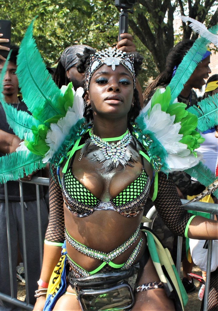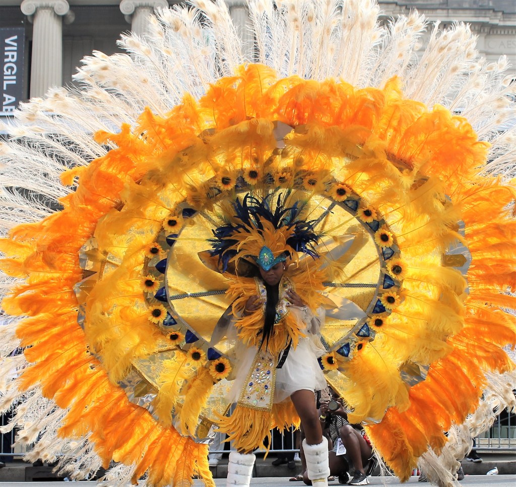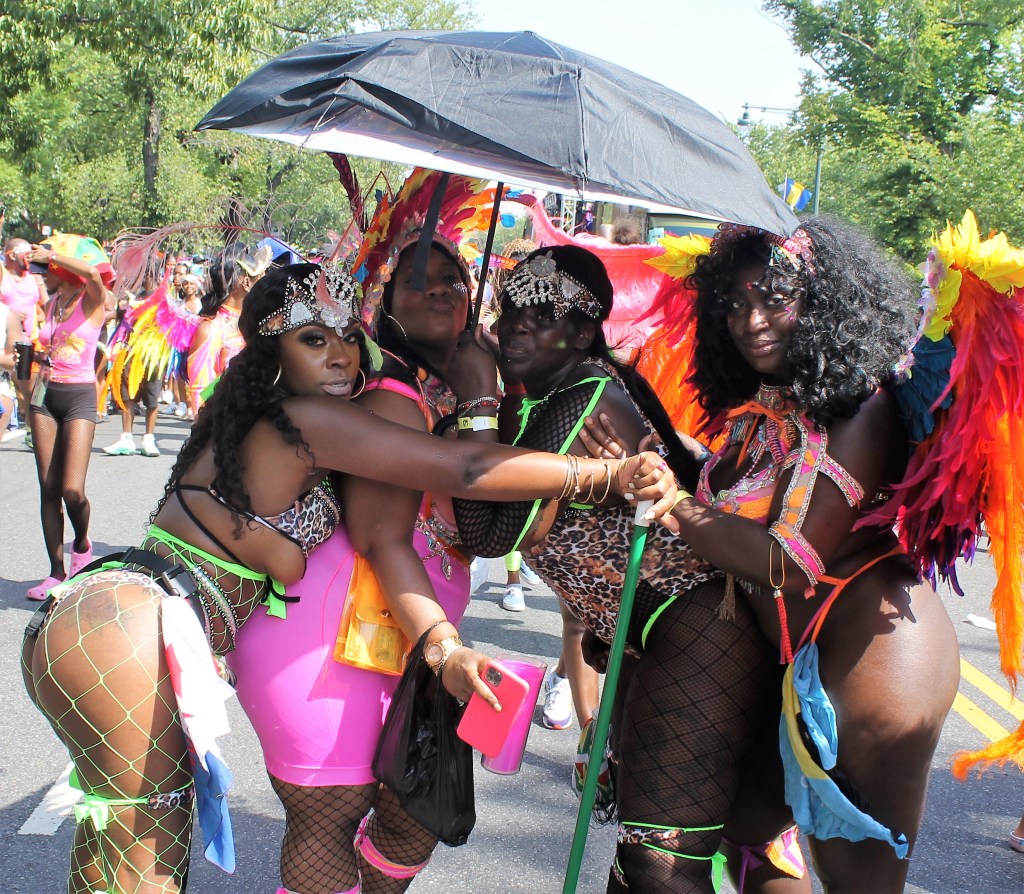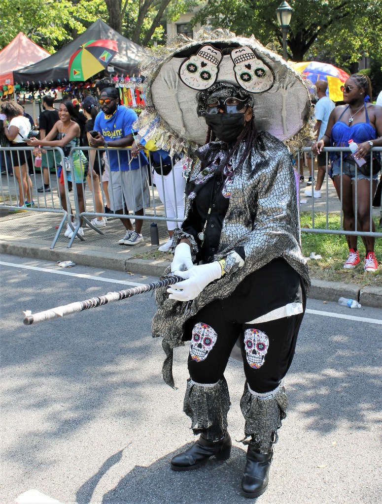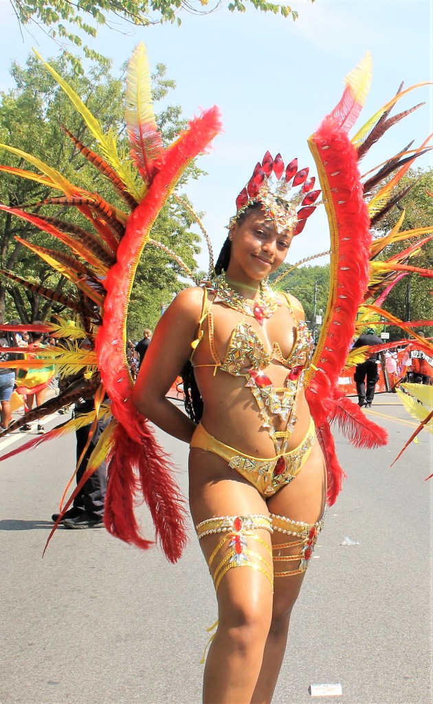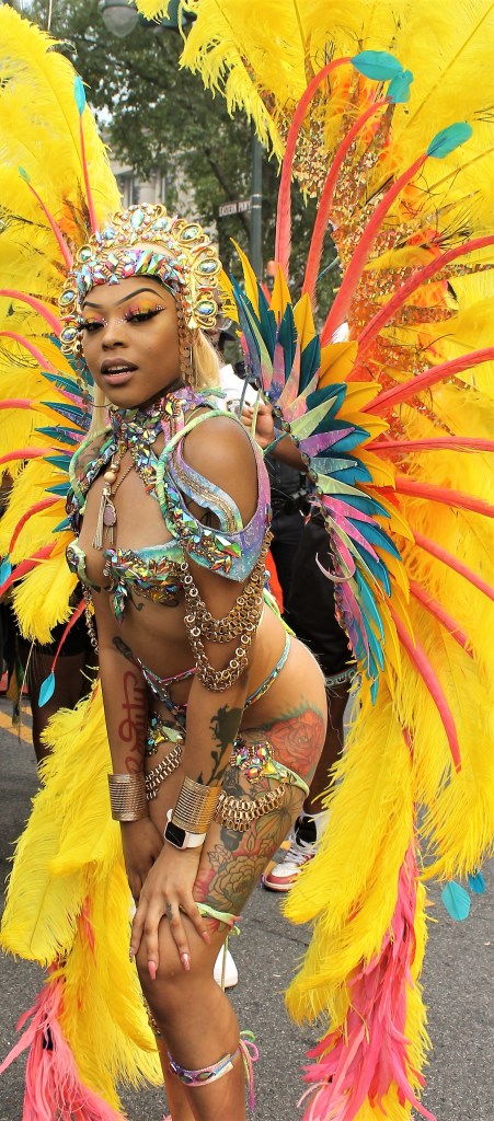 After a 2 year in person absence, The West Indian Labor Day Parade was in full force. Thousands of marchers kept true to the tradition of events that go on during Carnival in the islands of the Caribbean. The 53rd annual parade was nothing short of spectacular with masqueraders, costumers, and tractor trailer trucks with the tallest and loudest speakers of any parade in NYC. Hundreds of fans marched with their favorite groups along the 2 mile stretch of the parade route on Eastern Parkway. Since NYC is frigid cold during the actual time of Carnival in February or March, parade organizers decided to recreate the fashion and tradition of Carnival in hot early September. Once I made my way onto Eastern Parkway near Washington Ave., the enticing aroma of seasoned food drew me to see what was on the menu. Kiosk after kiosk offered all kinds of West Indian foods from roti to jerk chicken to fried fish…the list was endless. As I was chowing down some delicious food from Kedisha Dickinson’s kiosk, I heard the sound of the steel drums coming up the parade route. The NYPD Brass Band got this party started with some really good beats.