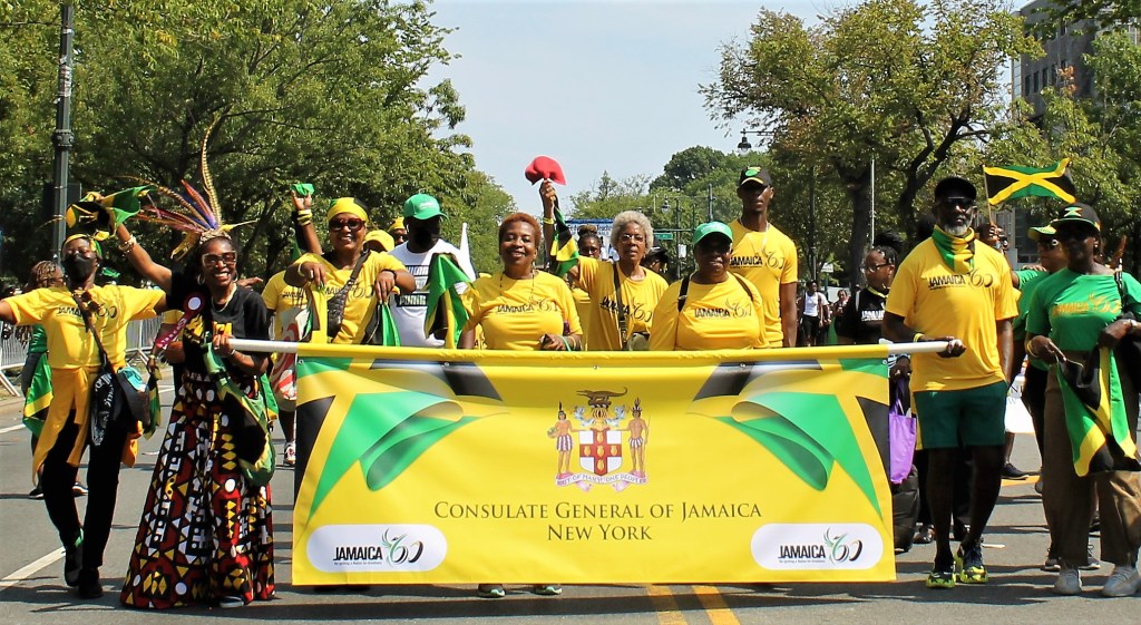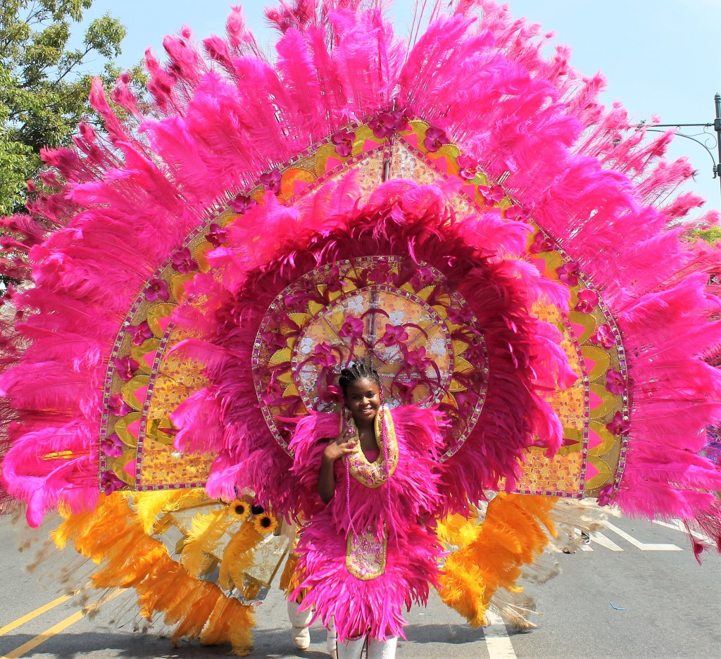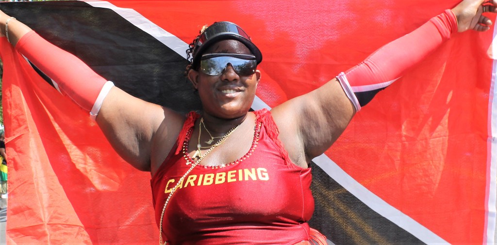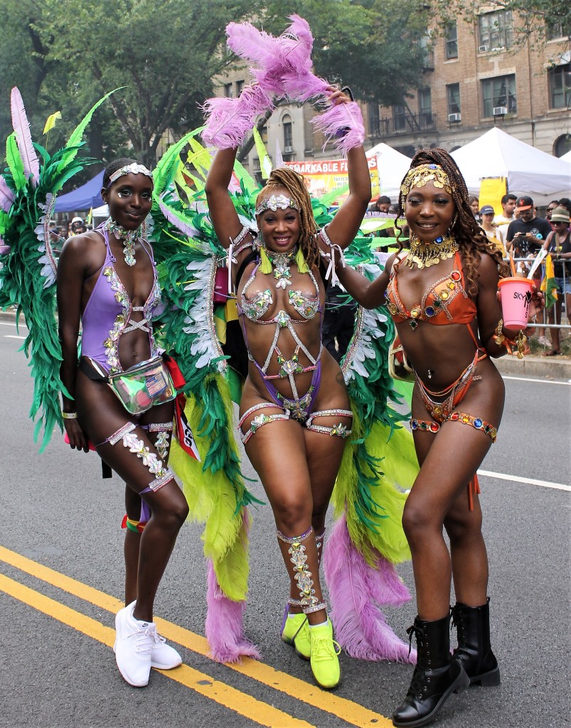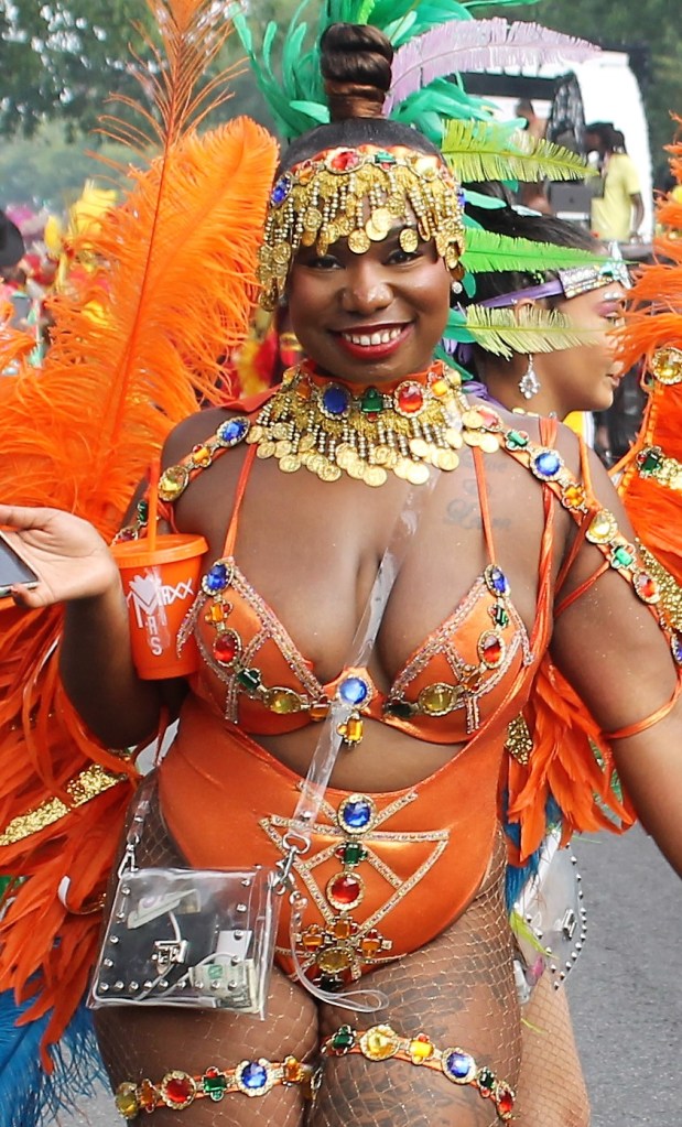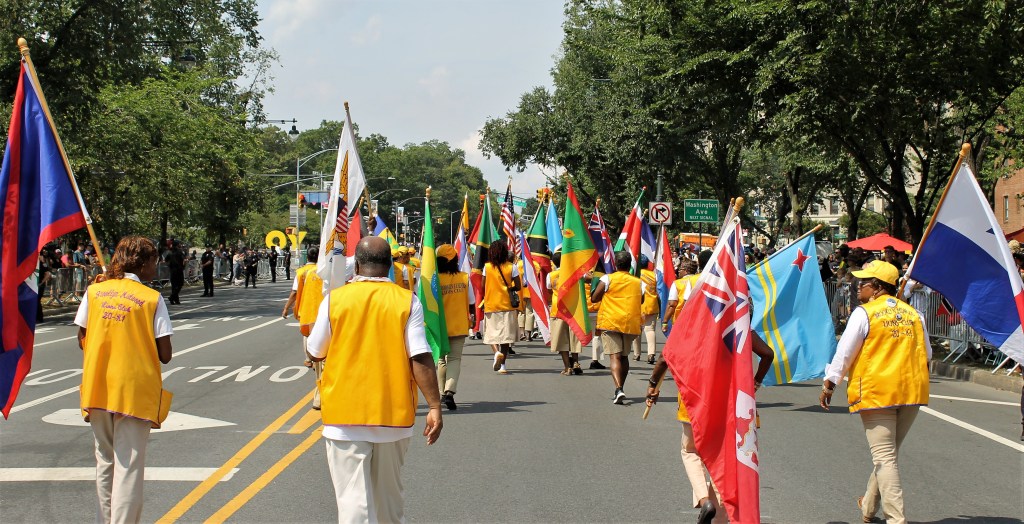After a 2 year in person absence, The West Indian Labor Day Parade was in full force. Thousands of marchers kept true to the tradition of events that go on during Carnival in the islands of the Caribbean. The 53rd annual parade was nothing short of spectacular with masqueraders, costumers, and tractor trailer trucks with the tallest and loudest speakers of any parade in NYC. Hundreds of fans marched with their favorite groups along the 2 mile stretch of the parade route on Eastern Parkway. Since NYC is frigid cold during the actual time of Carnival in February or March, parade organizers decided to recreate the fashion and tradition of Carnival in hot early September. Once I made my way onto Eastern Parkway near Washington Ave., the enticing aroma of seasoned food drew me to see what was on the menu. Kiosk after kiosk offered all kinds of West Indian foods from roti to jerk chicken to fried fish…the list was endless. As I was chowing down some delicious food from Kedisha Dickinson’s kiosk, I heard the sound of the steel drums coming up the parade route. The NYPD Brass Band got this party started with some really good beats.