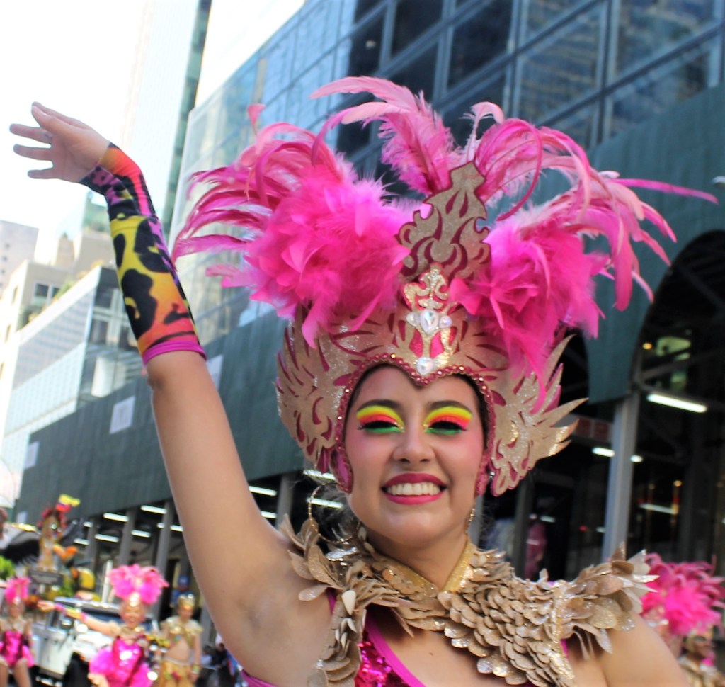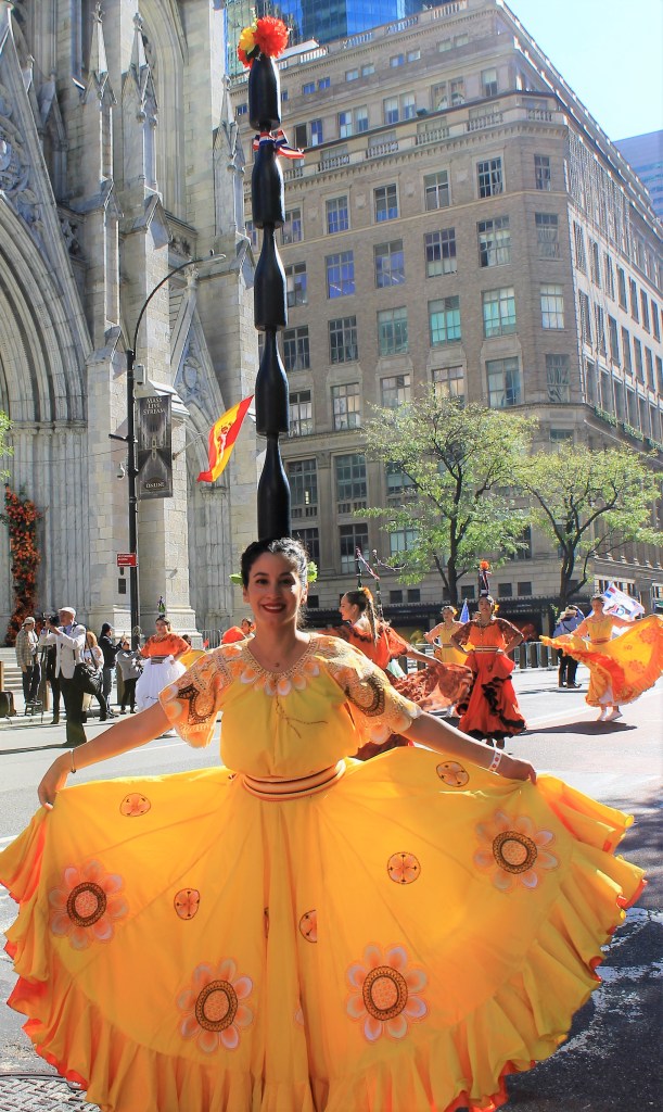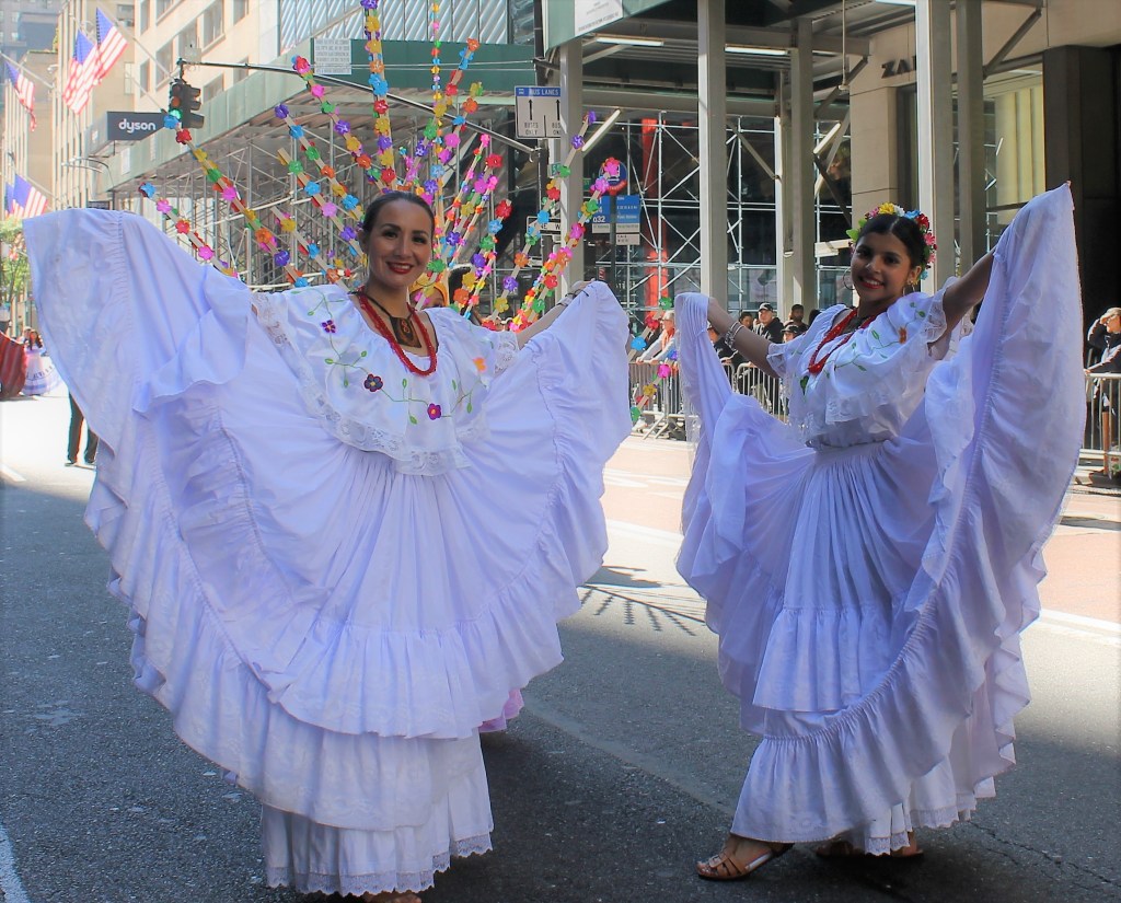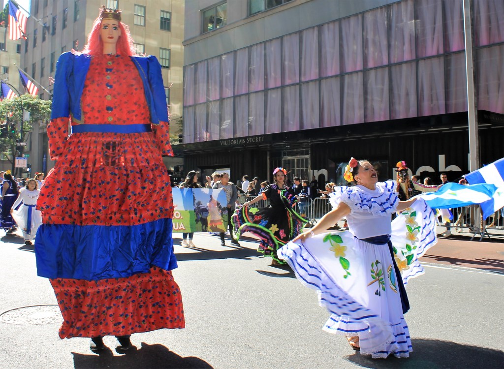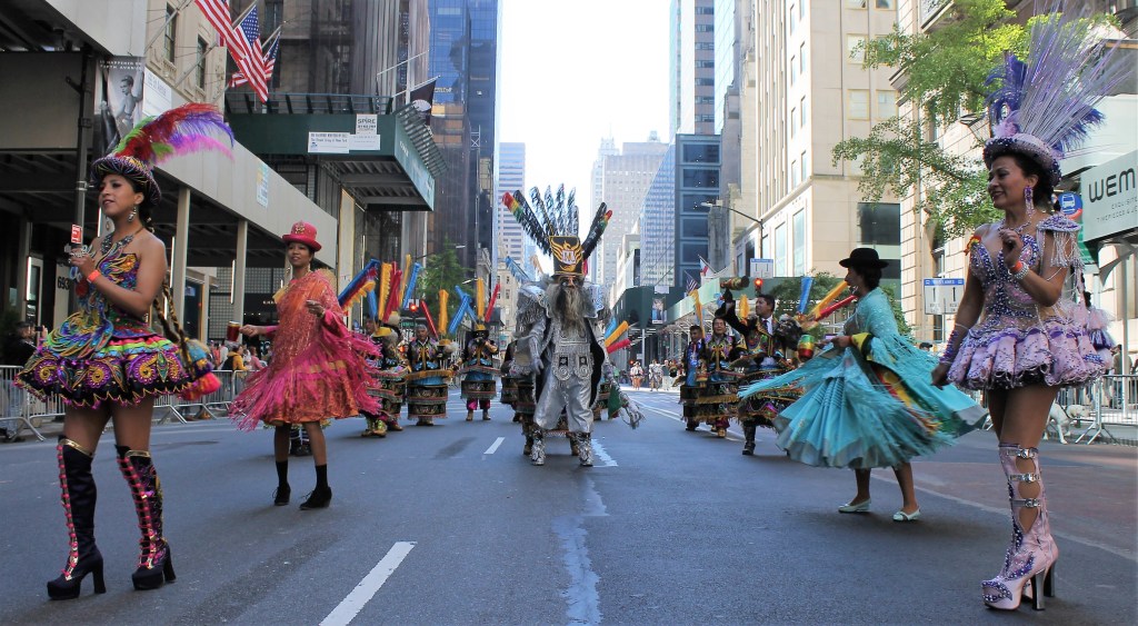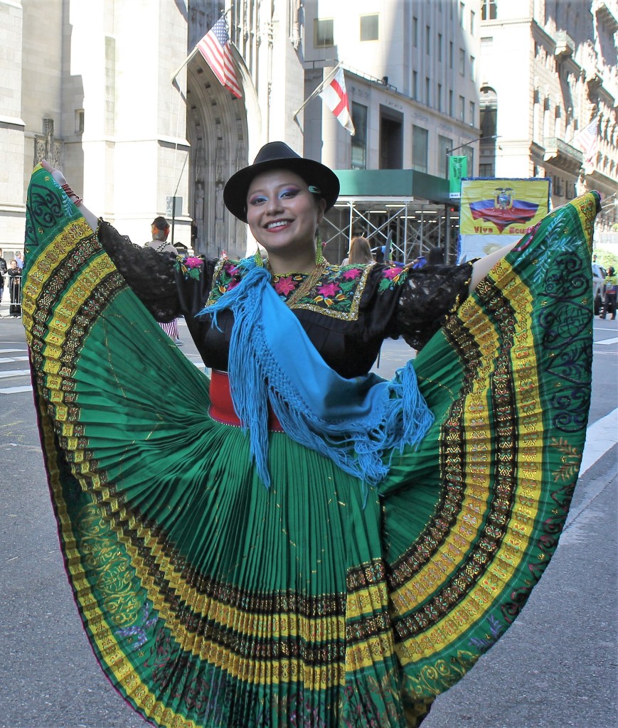 Nicaragua had a small group representing their culture and was a good introduction for the large group from Panama. One of the nicest thing s about the Panamanian group is they bring up student marchers from Panama to be part of the huge celebration. Then a huge group of ladies appeared to display traditional dresses in the form of polleras. They were amazing. Then another colorful group of Molas came out to display their beautiful layered clothing. Wrapping up that group was another set of drum and bugle marching bands. Peru had a nice group of dancers and amazing costumes. Puerto Rico had a small group of bomba dancers. Paraguay had a special group of bottle balancing ladies. They were amazing. Venezuela closed out the parade with a lively drum group that went from one side of 5th Ave. to the other to anyone waving a Venezuelan flag and had them dance to the beat. This was truly an amazing display of culture, music and dance to celebrate the life and contributions of Hispanics in New York and the World. This was a parade like no other. Me siento muy orgulloso de mi Cuidad y mi hermanos y hermanas Hispana. (I feel proud of my City and of my Spanish brothers and sisters).