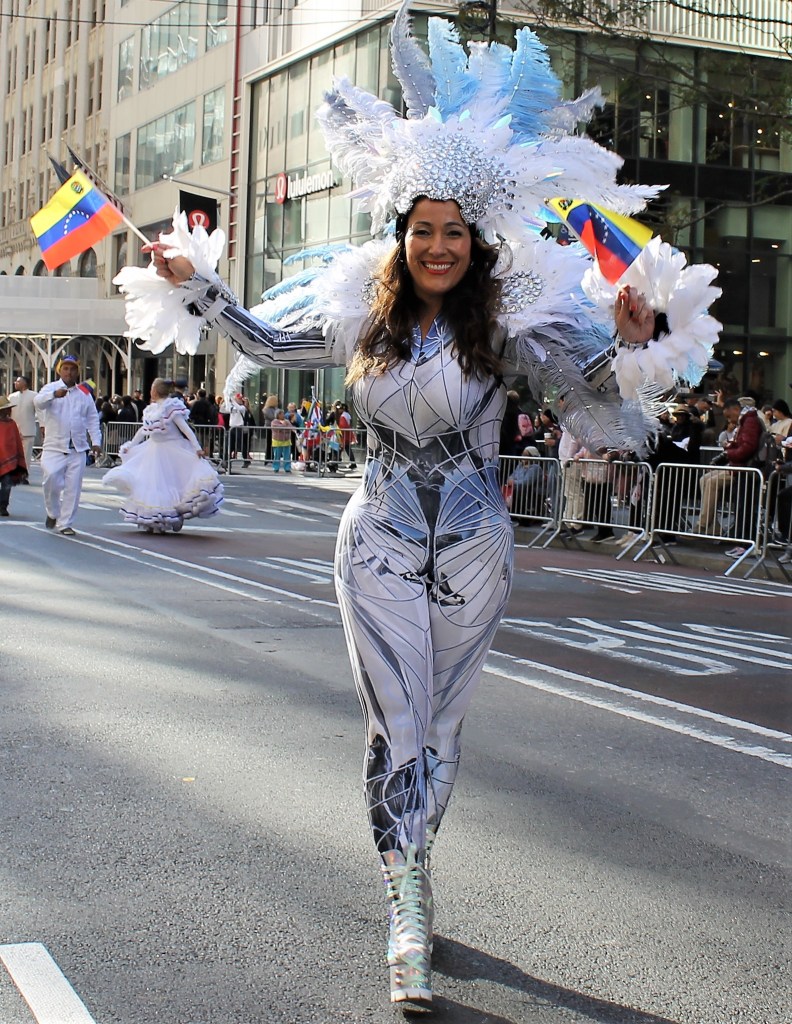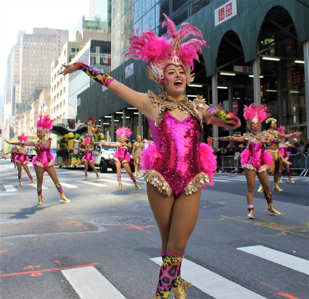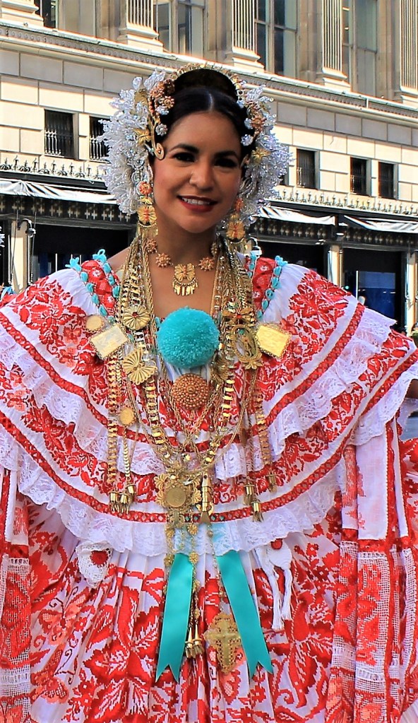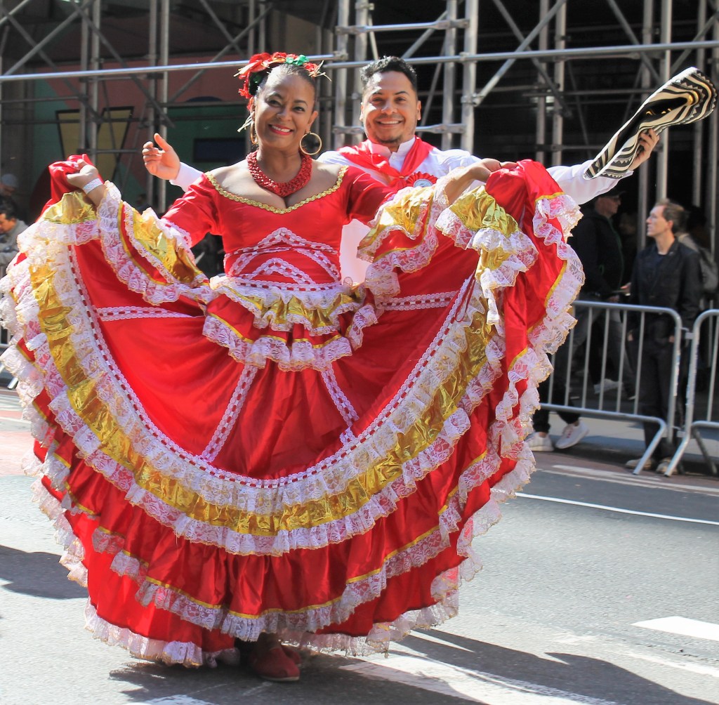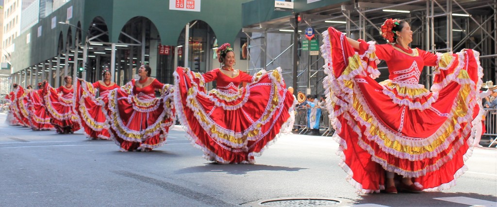 Nicaragua had a small group representing their culture and was a good introduction for the large group from Panama. One of the nicest thing s about the Panamanian group is they bring up student marchers from Panama to be part of the huge celebration. Then a huge group of ladies appeared to display traditional dresses in the form of polleras. They were amazing. Then another colorful group of Molas came out to display their beautiful layered clothing. Wrapping up that group was another set of drum and bugle marching bands. Peru had a nice group of dancers and amazing costumes. Puerto Rico had a small group of bomba dancers. Paraguay had a special group of bottle balancing ladies. They were amazing. Venezuela closed out the parade with a lively drum group that went from one side of 5th Ave. to the other to anyone waving a Venezuelan flag and had them dance to the beat. This was truly an amazing display of culture, music and dance to celebrate the life and contributions of Hispanics in New York and the World. This was a parade like no other. Me siento muy orgulloso de mi Cuidad y mi hermanos y hermanas Hispana. (I feel proud of my City and of my Spanish brothers and sisters).