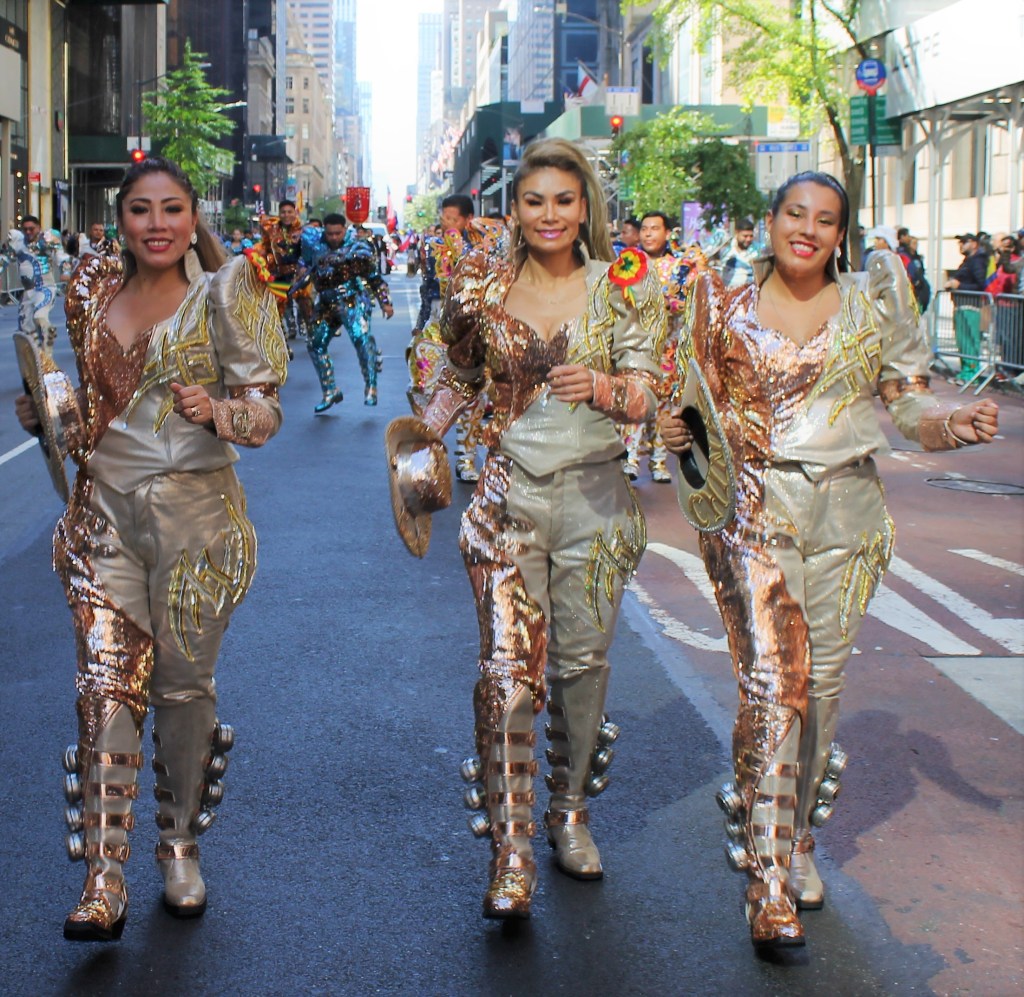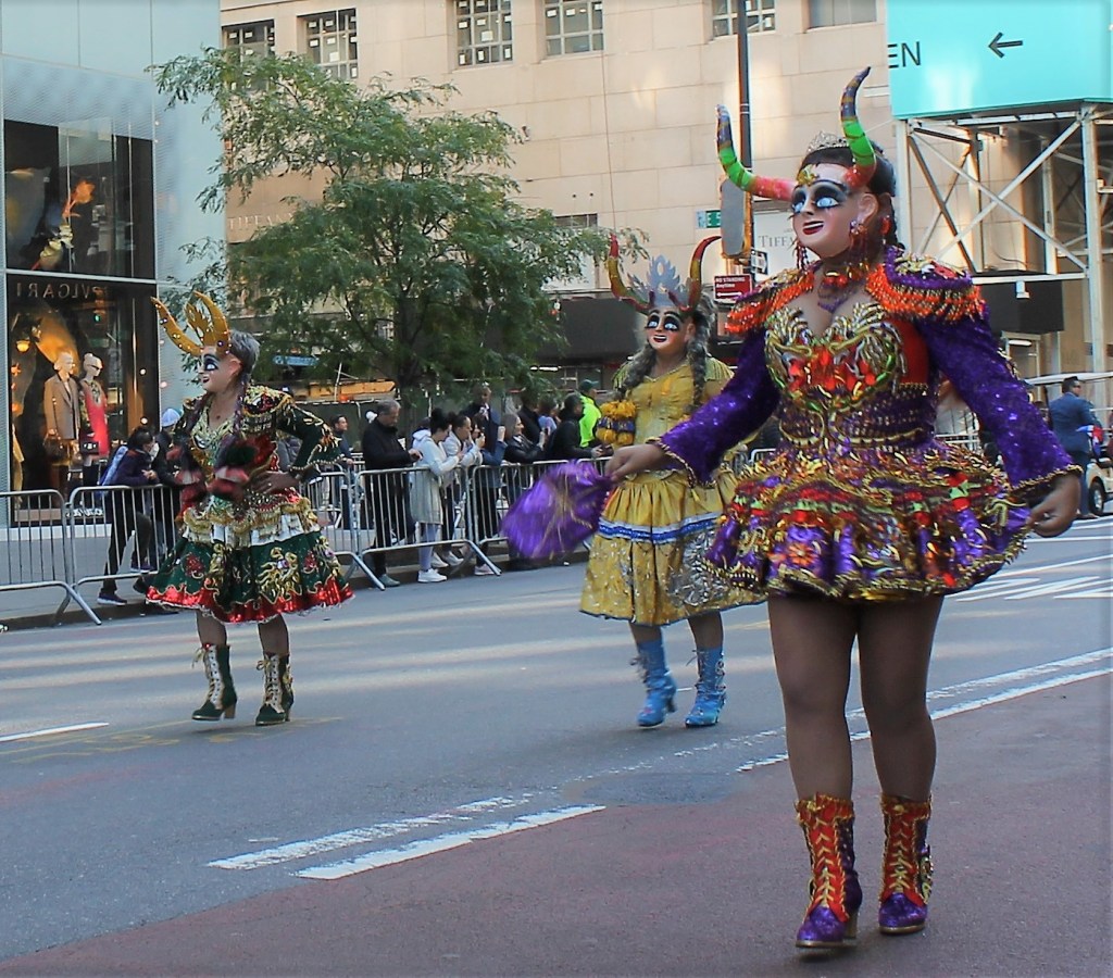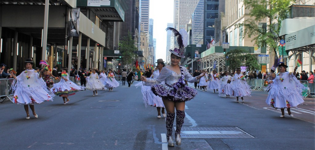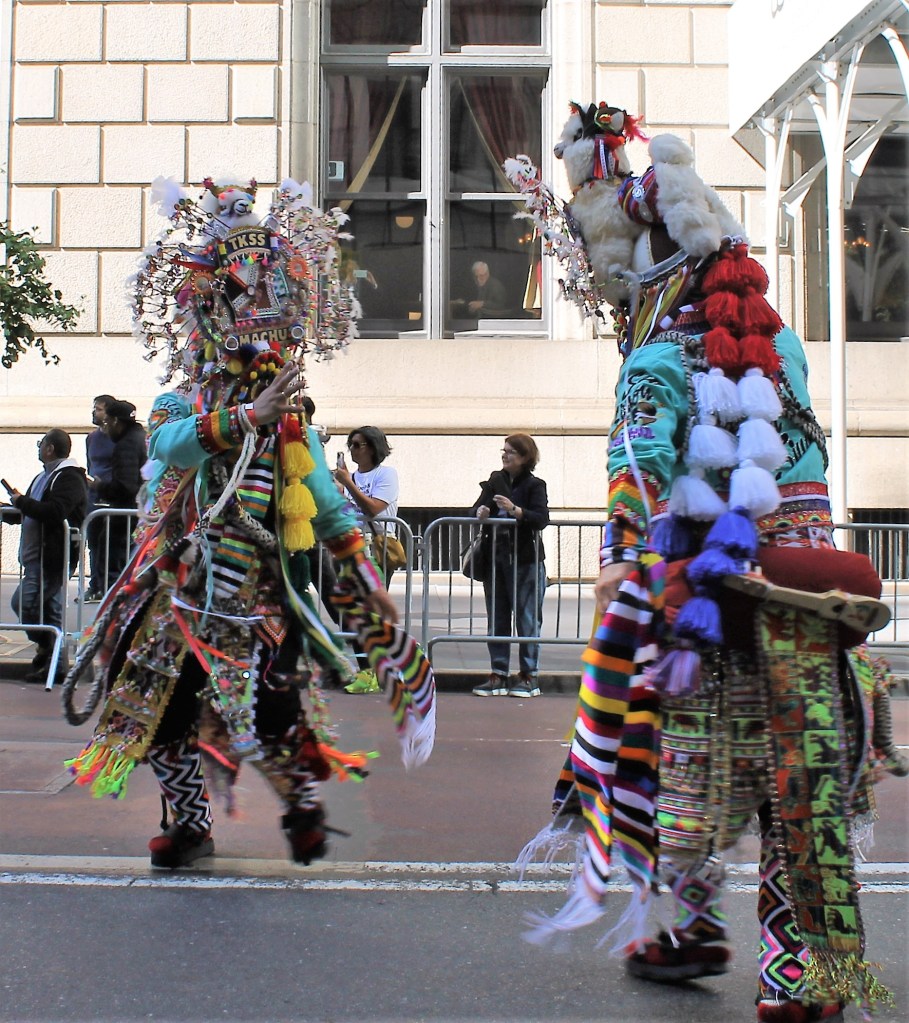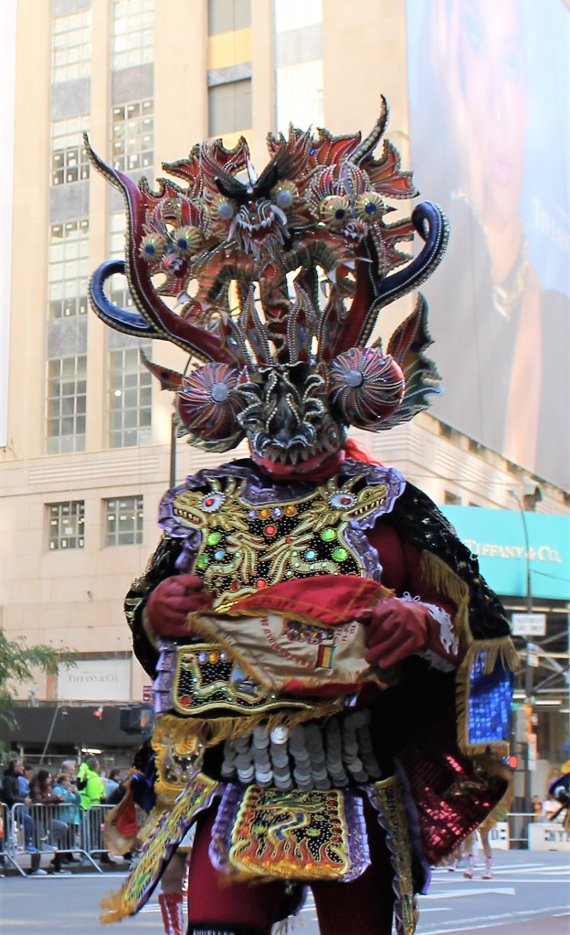 In typical form for this parade, the countries representatives appear in alphabetical order with Argentina showing off countryside dancing followed by a float with a band playing tango music for about a dozen dancers blazing their way up 5th Ave. Then a big group made their appearance for plenty of adoring fans. The Bolivians always have some of the best costumes and dances. Leading the various groups were people dressed in devilish masks representing figures from mythology and historical accounts. The Morenales are one part of Bolivian culture and the best boots of any parade in NYC. They were soon followed by the Tinkus dancing a thousand year old ritual dance. Probably the most anticipated group and high energy group are the San Simon Caporales with their snazzy costumes and festive dance.
