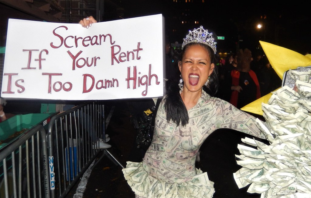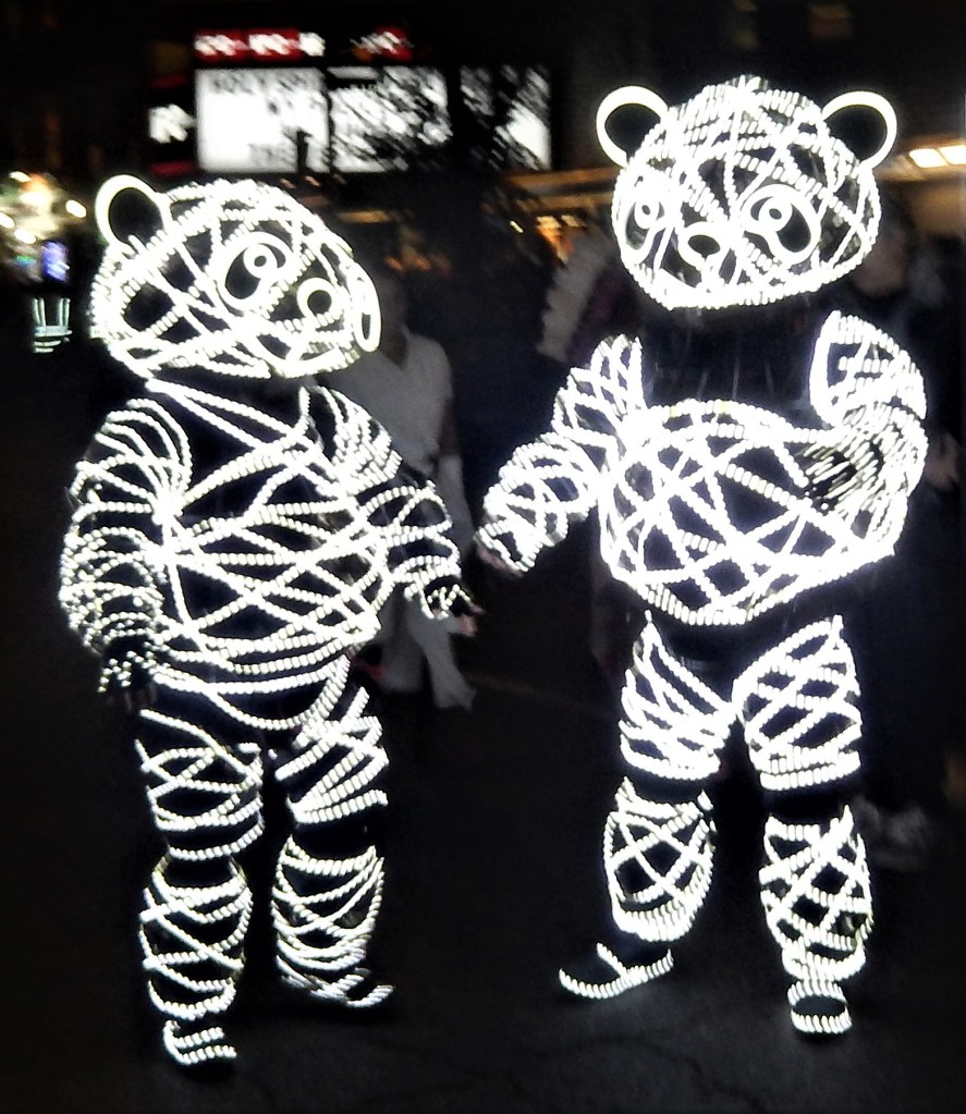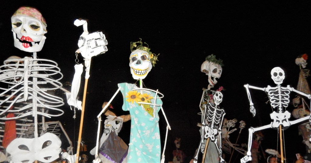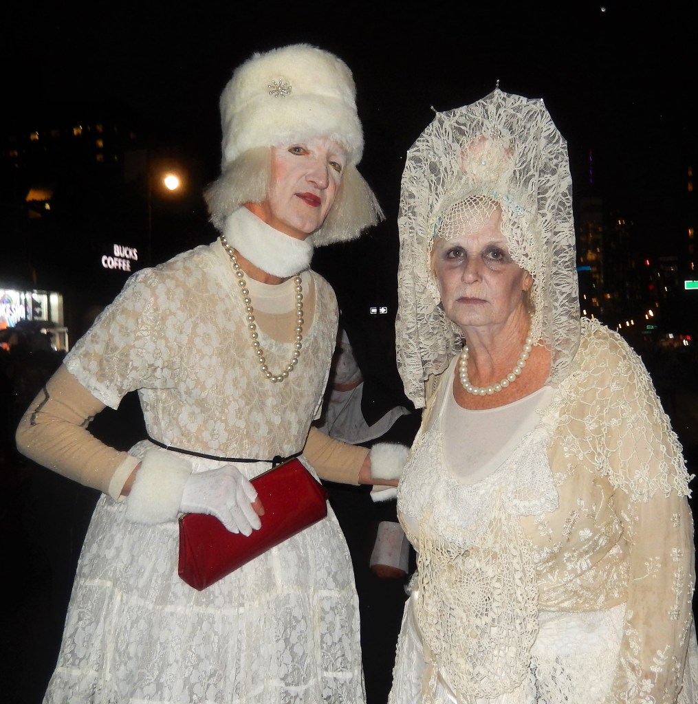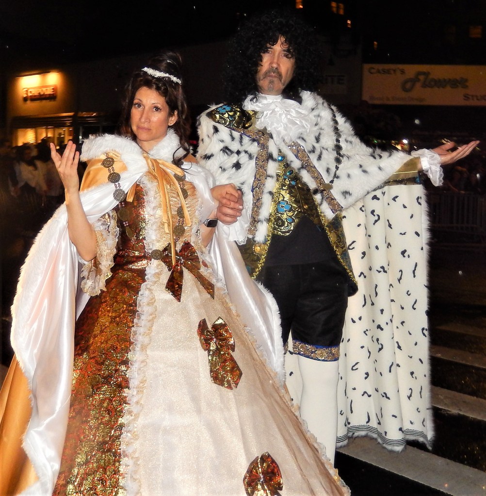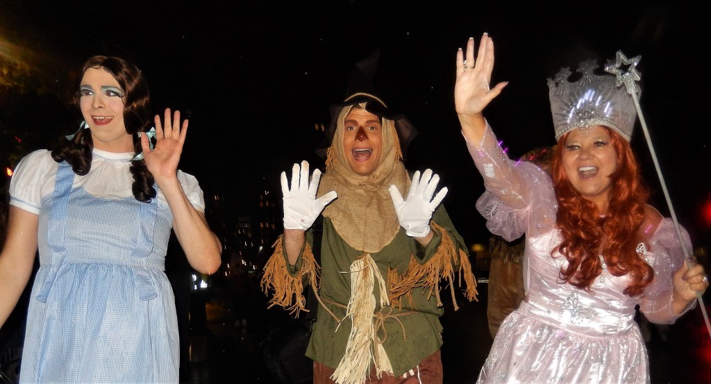 As typical with this parade, blessings to all are called for by a friendly group dressed in white except for some reason there was no sage smoke or silver glitter…guess inflation made that part a casualty. The loud trumpet blaring meant the start of the parade was soon to arrive with a brass band dressed as bees getting the crowd worked up. A large group of puppet skeletons greeted the crowd followed by a large scary pumpkin patch. An all electric guitar band rocked out with some more crazy costumes following them. Of course a parade isn’t a parade without a marching band. The hometown Queer Big Apple Corps Marching Band kicked things in high gear and really got the crowd fired up.