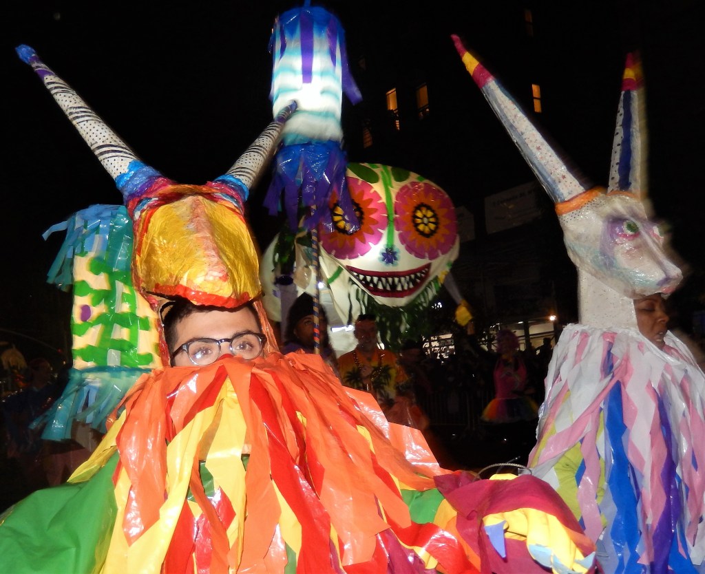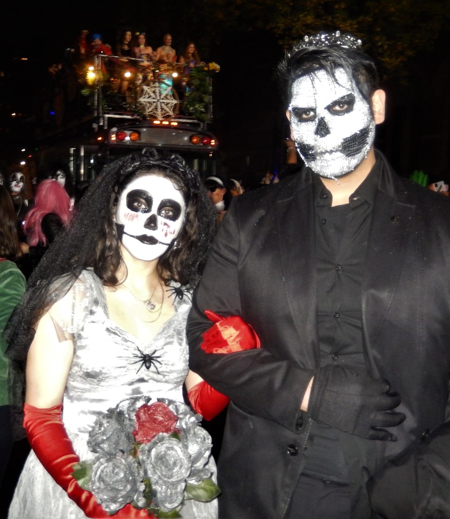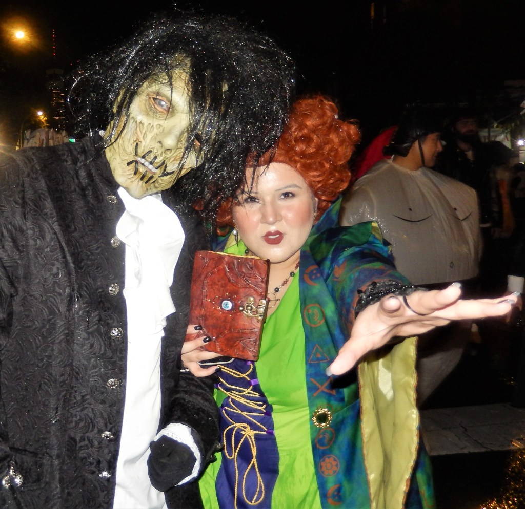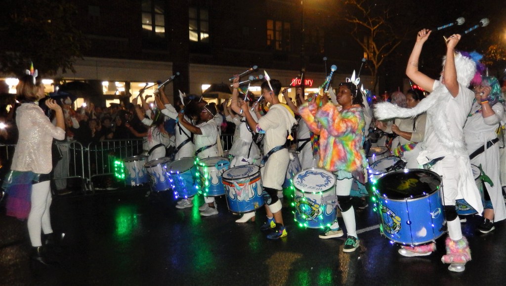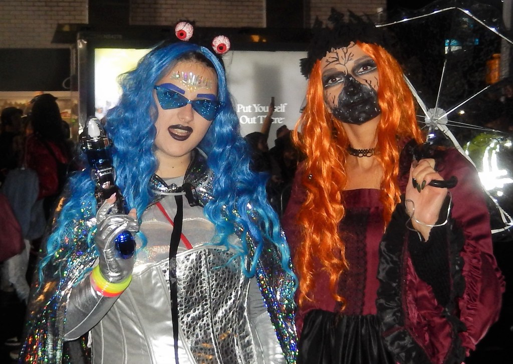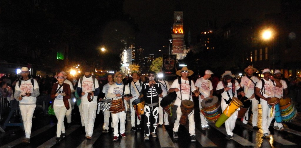 A perennial favorite, The Hungry March Band, played a hopping tune to get people dancing. The thunderous beats of the all female Fogo Azul kept the party going. Dozens of colorful floats and amazing groups kept things going. Marchers in scary costumes attempt to scare some of the million revelers. Screams can be heard from down the block. Shout out to the crew of The Ghostbusters with their original replicas of both cars used in the blockbuster movies. La Fortaleza was a Mexican inspired float with lots of colorful costumes and makeup honoring the Day of the Dead. The parade has always had a large international attraction and this year a musical band from Italy, Vecia Trieste, played a nice tune for the crowd. A steady rain come down towards the middle part of the parade but that didn’t stop the crowd from going into a mad frenzy of yelling when the popular Michael Jackson Thriller Dance group zombied up the parade route. They always put on a good show. The all-female drum band Batala were so much into their performance they even had Darth Vader break dancing. This is one of NYCs finest parades and brings out the best in NYC creativity. If you have never been to one, it should be on your bucket list. Scare Ya Later.