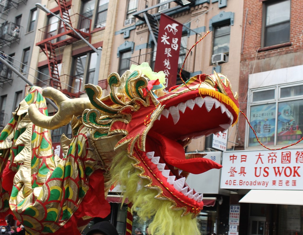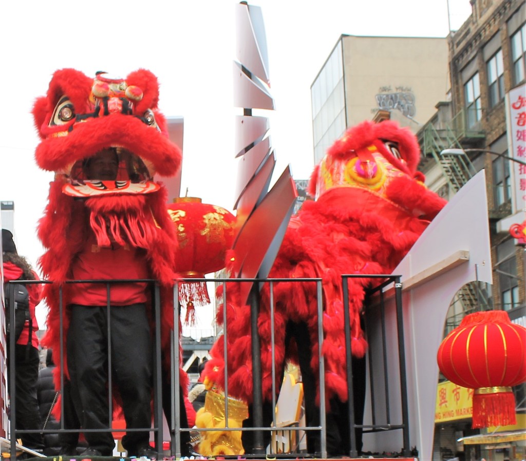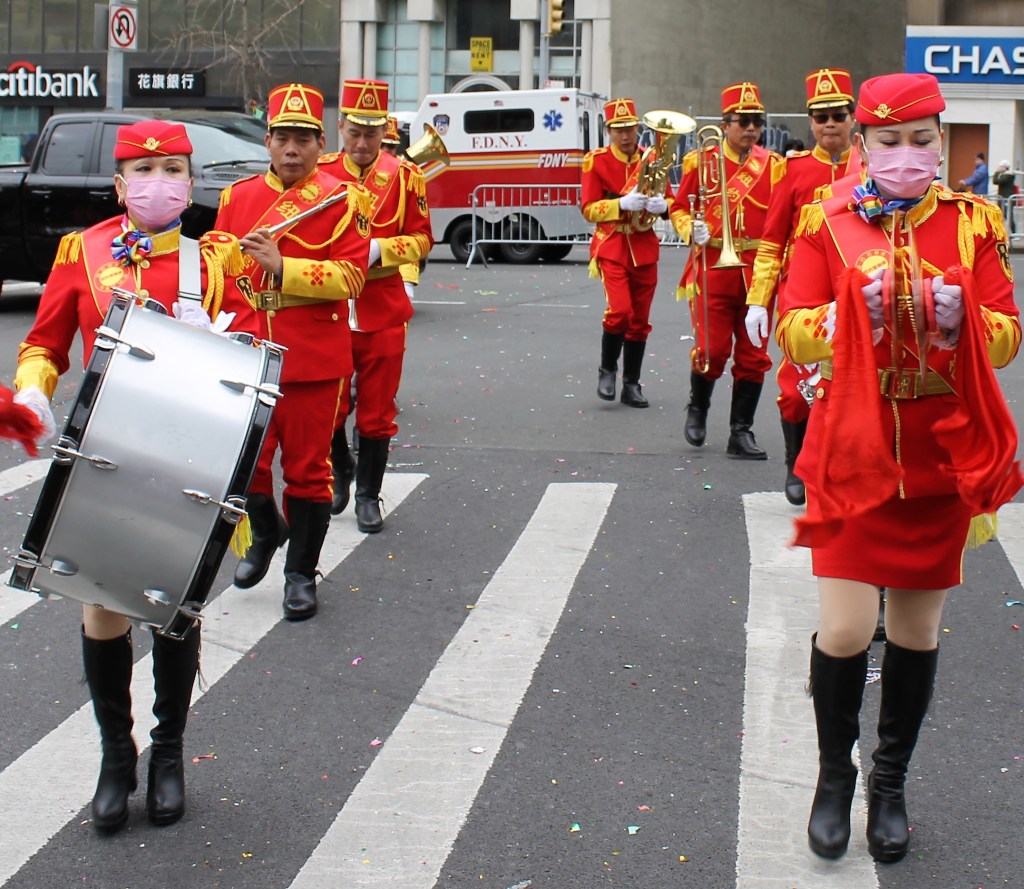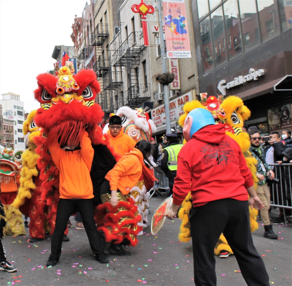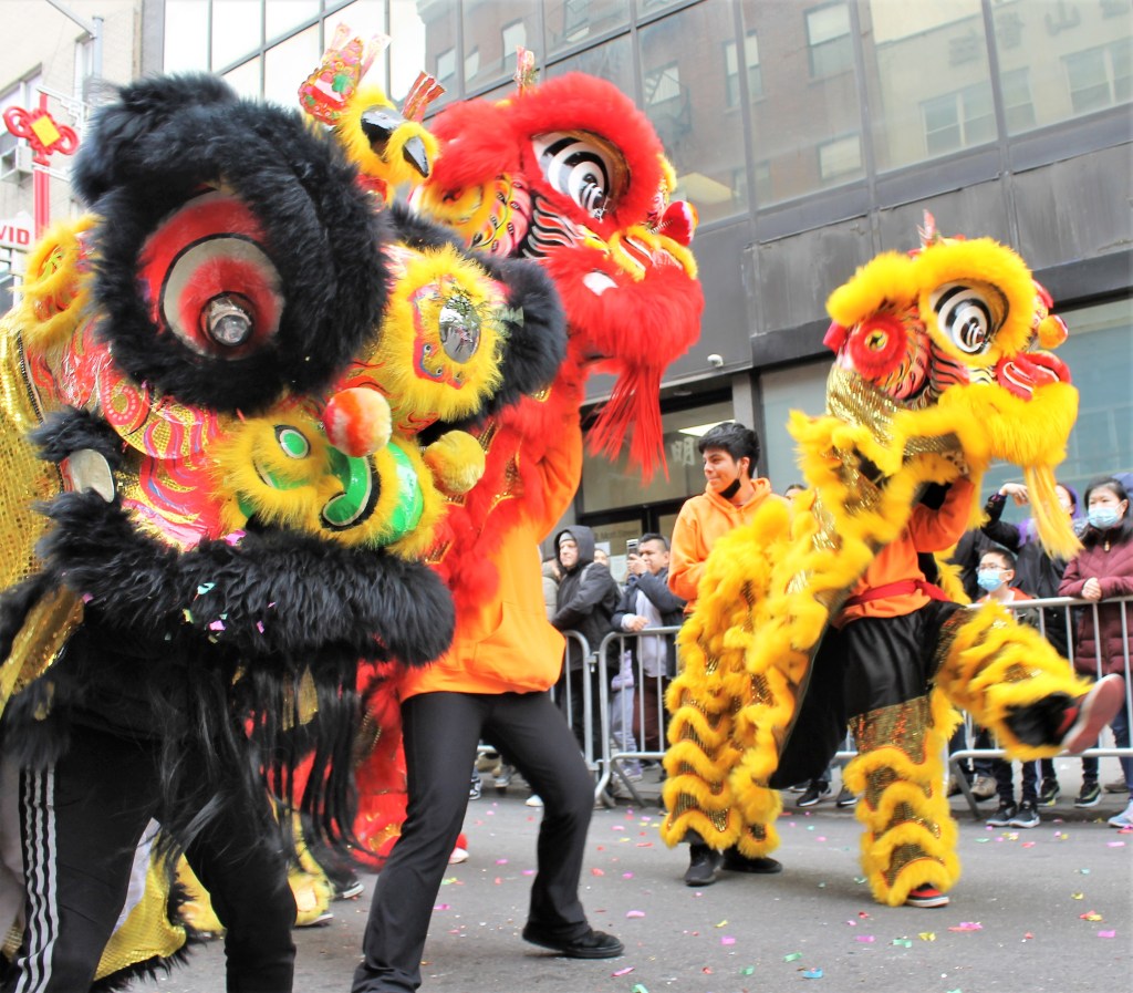 The closing Lunar New Year festivities were celebrated in grand style in Chinatown with dancing lions and weaving dragons along the parade route starting on Mott St. and hopping its way to East Broadway and then to Sara Roosevelt Park. Thousands cheered on their favorite groups and some revelers reached out to please the dancing lions with red envelopes. There is always a pre-parade ceremony held on the corner of Mott and Hester Streets where NY heavyweight politicians greeted the crowd and gave some encouraging words. Many gave thanks to Stephen Tin, president of Better Chinatown, for working so tirelessly to bring forth a top notch event for the city over the last 25 years. Seated on stage for the ceremony were US Rep. Nydia Velazquez from NY, US Senator Chuck Schumer from NY, Governor Kathy Hochul, NYS AG Leticia James, and NYC Mayor Adams. They all stayed for the annual feeding lettuce to the lions for good luck and prosperity. Then the parade started with the NYC Marching Band playing some upbeat tunes.