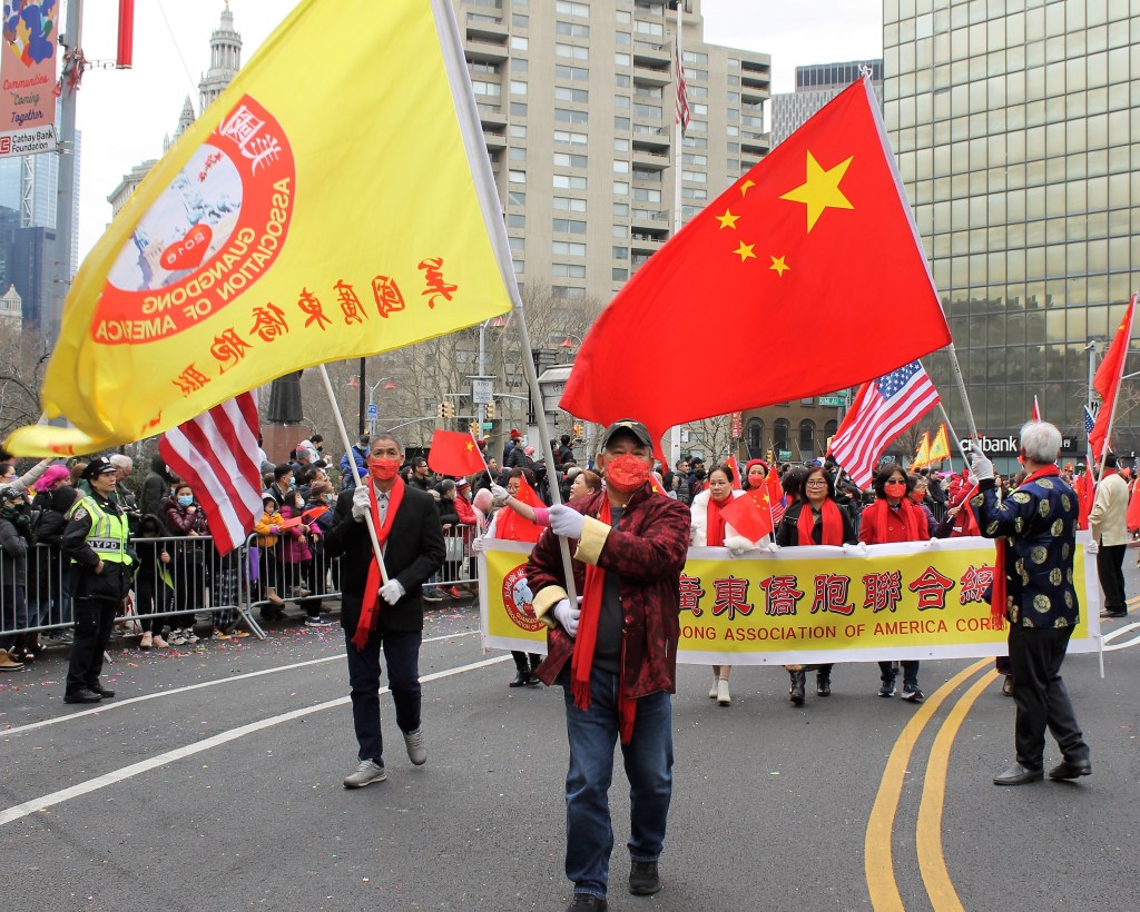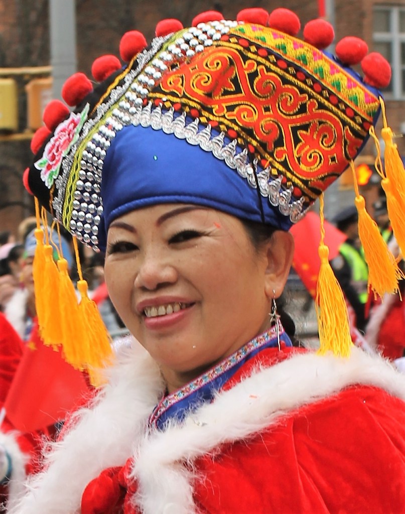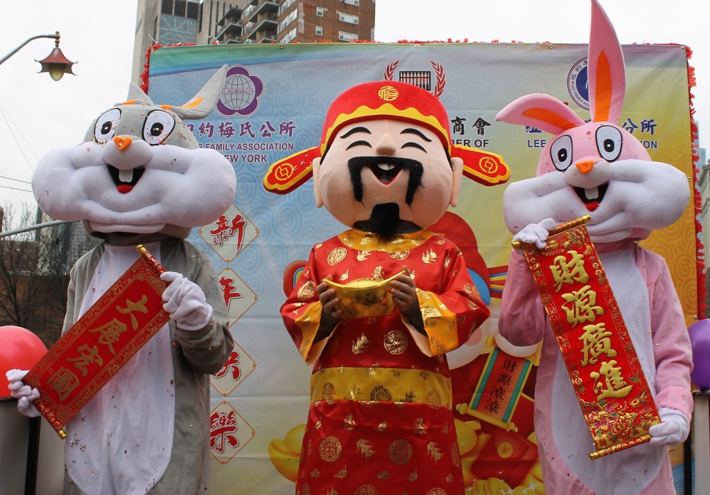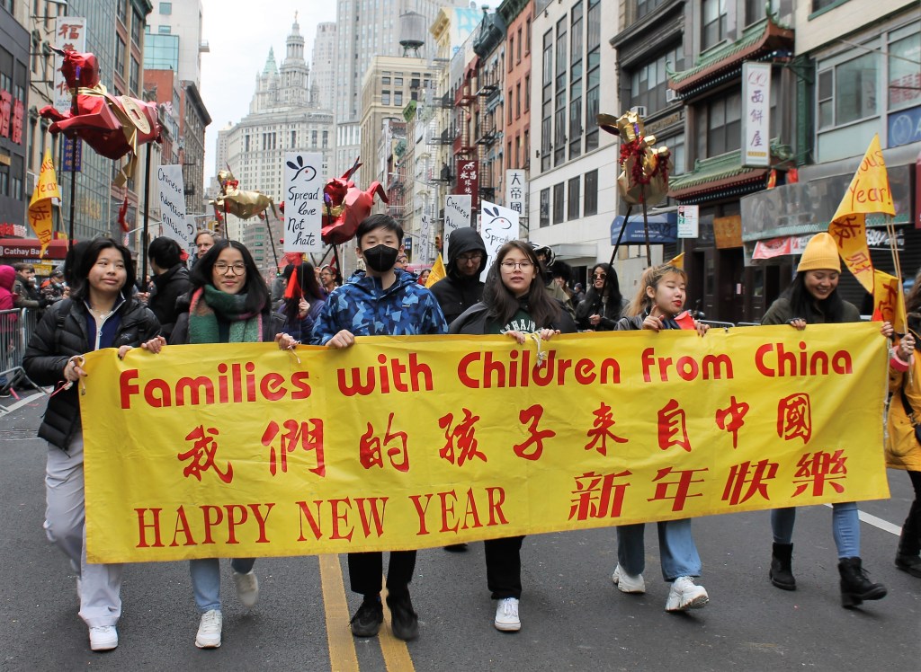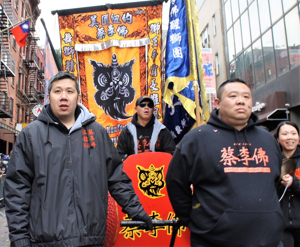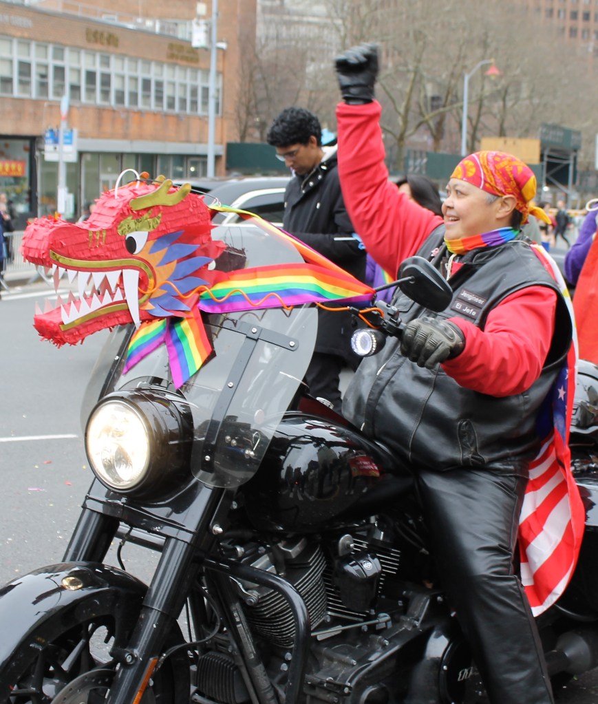 The closing Lunar New Year festivities were celebrated in grand style in Chinatown with dancing lions and weaving dragons along the parade route starting on Mott St. and hopping its way to East Broadway and then to Sara Roosevelt Park. Thousands cheered on their favorite groups and some revelers reached out to please the dancing lions with red envelopes. There is always a pre-parade ceremony held on the corner of Mott and Hester Streets where NY heavyweight politicians greeted the crowd and gave some encouraging words. Many gave thanks to Stephen Tin, president of Better Chinatown, for working so tirelessly to bring forth a top notch event for the city over the last 25 years. Seated on stage for the ceremony were US Rep. Nydia Velazquez from NY, US Senator Chuck Schumer from NY, Governor Kathy Hochul, NYS AG Leticia James, and NYC Mayor Adams. They all stayed for the annual feeding lettuce to the lions for good luck and prosperity. Then the parade started with the NYC Marching Band playing some upbeat tunes.
