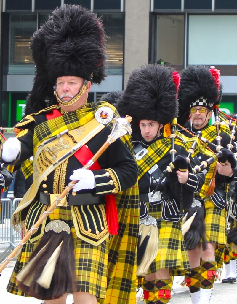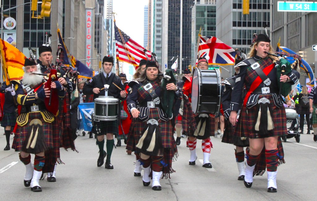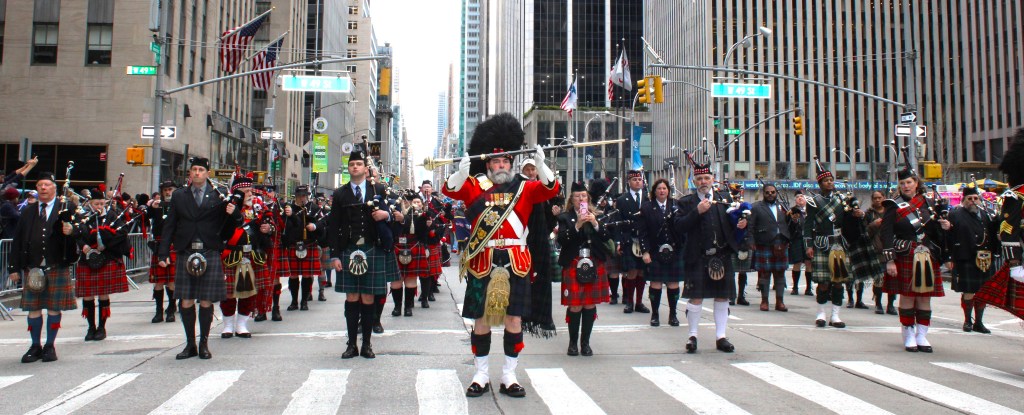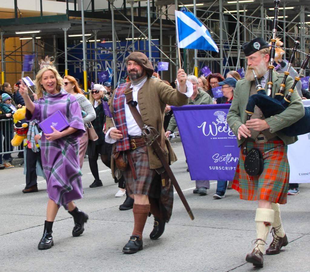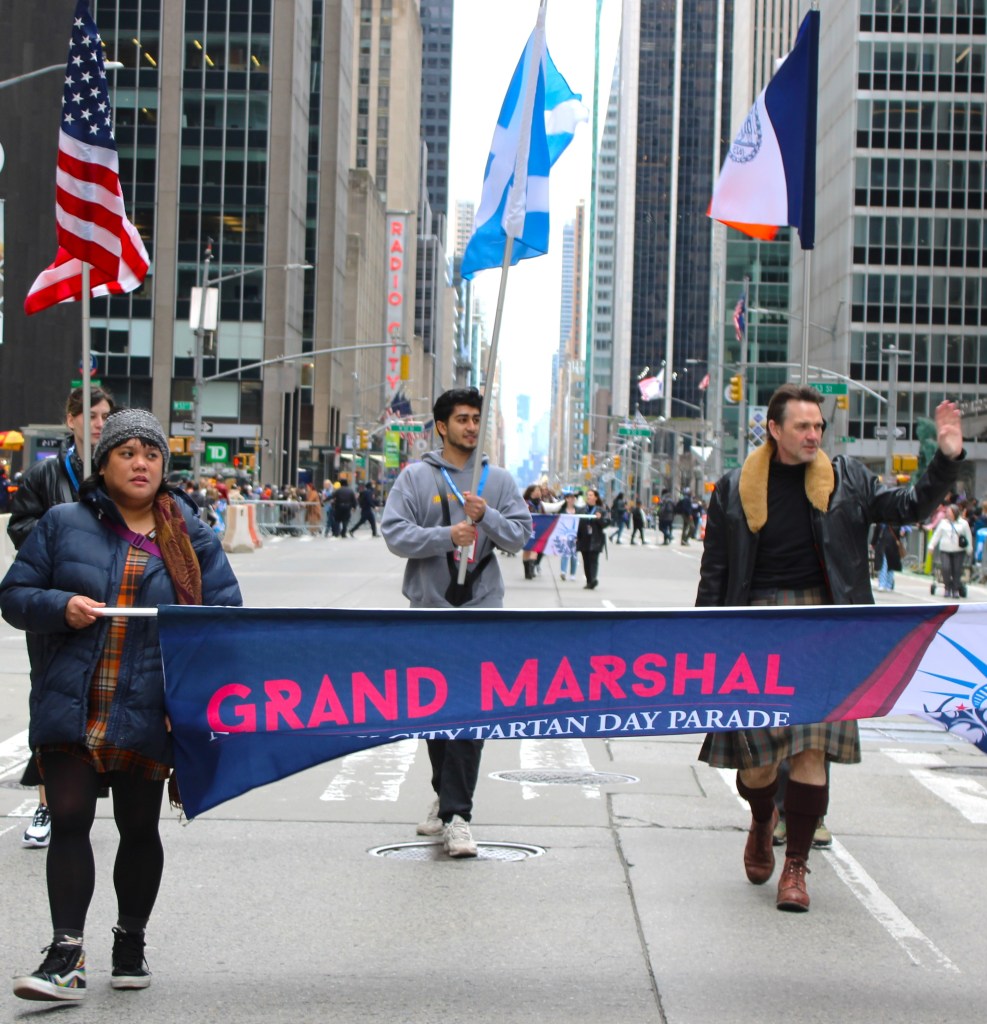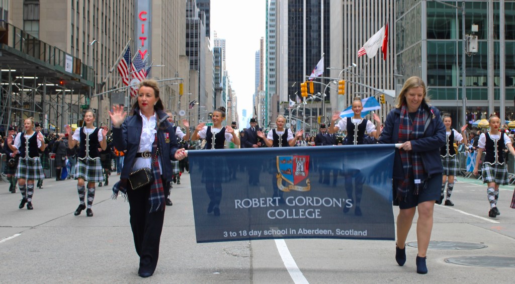 A week long celebration known as Tartan Week ends with a fun and lively parade up 6th Avenue from 44th to 55th streets. All things Scottish are celebrated with groups of Scottish ancestry making their way up the parade route for the 25th anniversary of the Tartan Day Parade. This year the great honor of being selected as Grand Marshall was famed actor Dougray Scott. He enjoyed every minute of the 2 hour event as marching groups stopped by his designated viewing area on 55th St. and put on a performance. One of the best parts of this parade is when groups from Scotland put on a show for the crowd. One of the first groups from Scotland was the Robert Gordon College Pipes and Drum Marching Band. They were excellent.