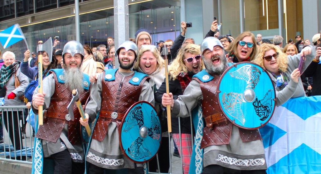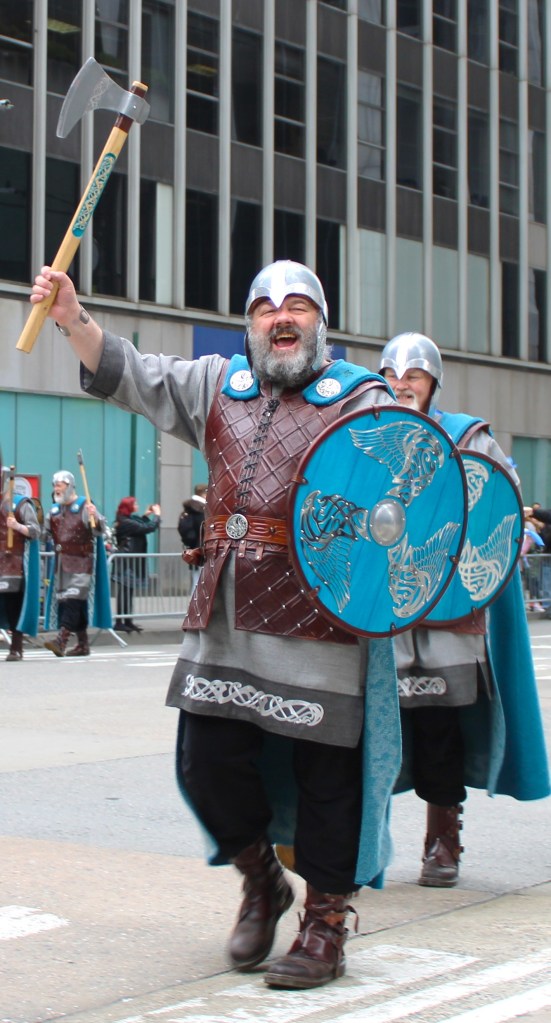 A group that comes from Kearny NJ always gets the crowd worked up. The Jock Nisbet Memorial Group has musicians from different groups that merged together to make this phenomenal group. A newcomer to this parade were the Naval Academy Cadets. They were really good. However, the headline group that hails from Merchiston, Edinburgh played their hearts out. A side story was that the father of one of the musicians flew the plane that brought the band to NYC. Cool Dad. Closing out the fun parade were the Vikings group raising axes and angst all along the parade route. It truly is a fun parade to attend even if you’re not Scottish.