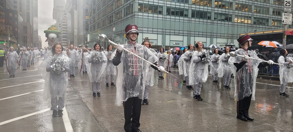 The Thanksgiving Day Parade always displays some of the best marching bands of the country. This year, the million plus fans that endured the soggy weather were treated to an elite ensemble of large bands. Right off the bat, the East Tennessee State University Buccaneers set the tone for what would be an amazing day of celebration. They were just one of a dozen marching bands that played brilliantly for the rain drenched crowd. One of he big draws for this parade are the number of celebrities that come out to take in the event. Some of the headliners included Bishop Briggs in a Wednesday float with matching dancers, living legends The Temptations, Natti Natasha, Coco Jones, Dan + Shay and many more were on different floats waving to the crowd.