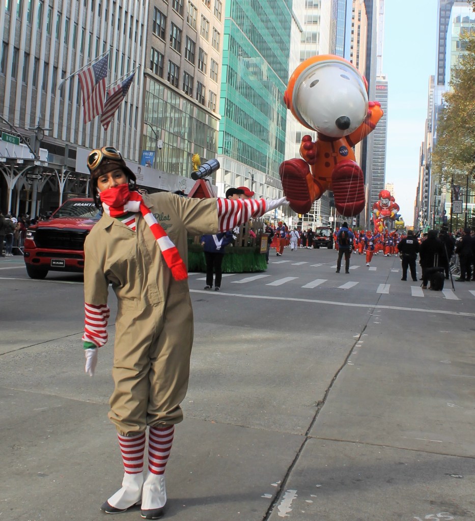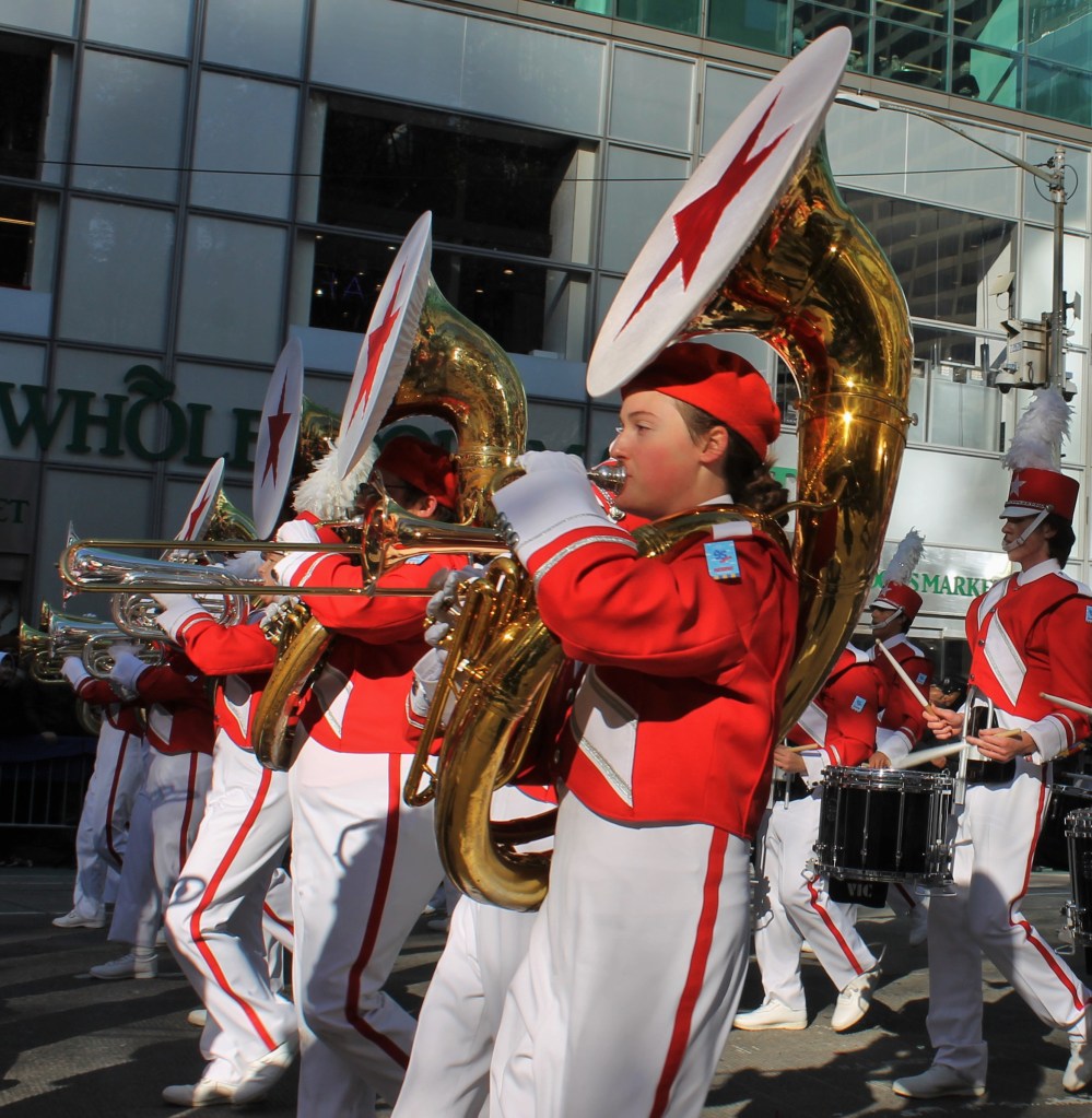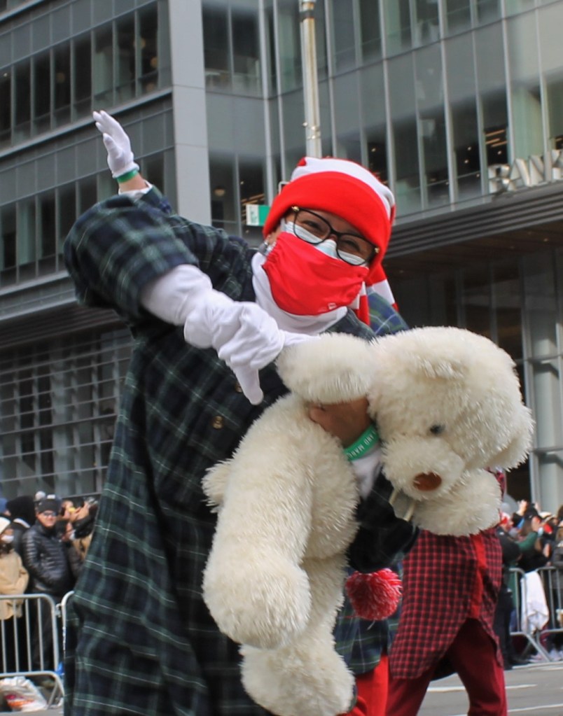 The excitement kept building up as more iconic large balloons made their way down the parade route on 6th Ave. towards Herald Square and the famous Macy’s department store where the event was televised to millions of people watched on television. Everyone’s favorite Spongebob Squarepants with his buddy Gary hitching a ride on his back got all the kids big and small excited. The older kids thought Goku was cool. But a show stealer was a new entry to the parade. Grogu aka Baby Yoda made its way up the parade route with young fans pointing and smiling. One HS marching band with a heavy drum line came from Brownsburg, Indiana. They were amazing to watch and listen to.