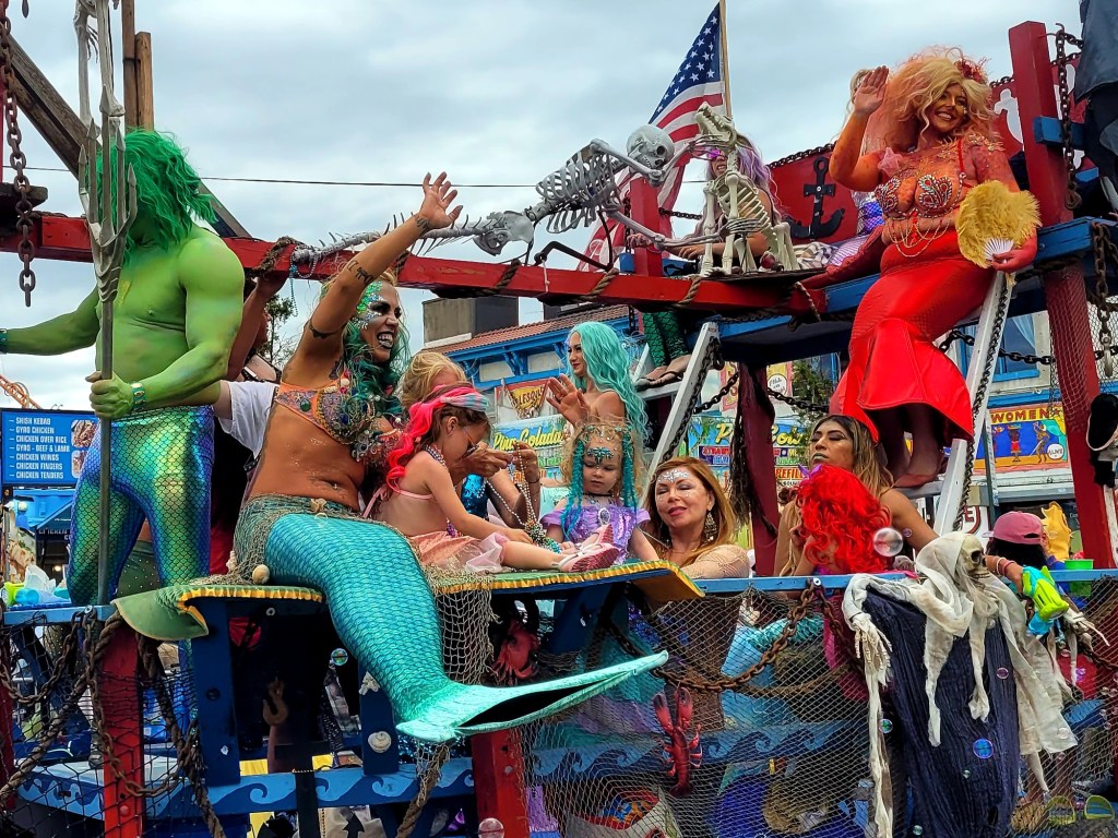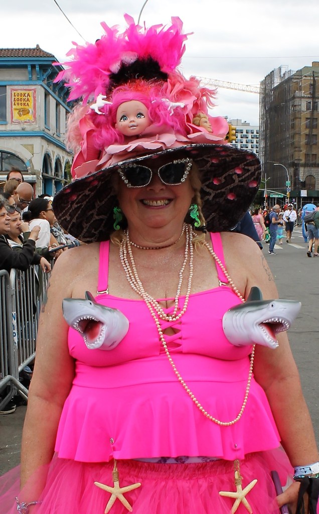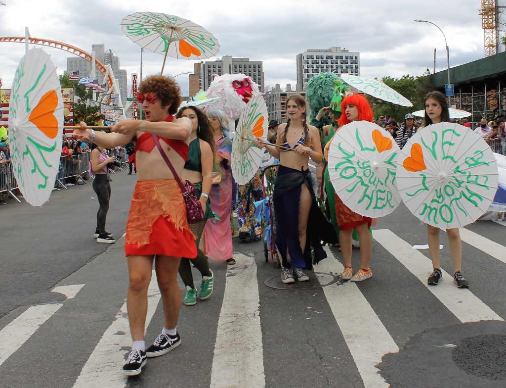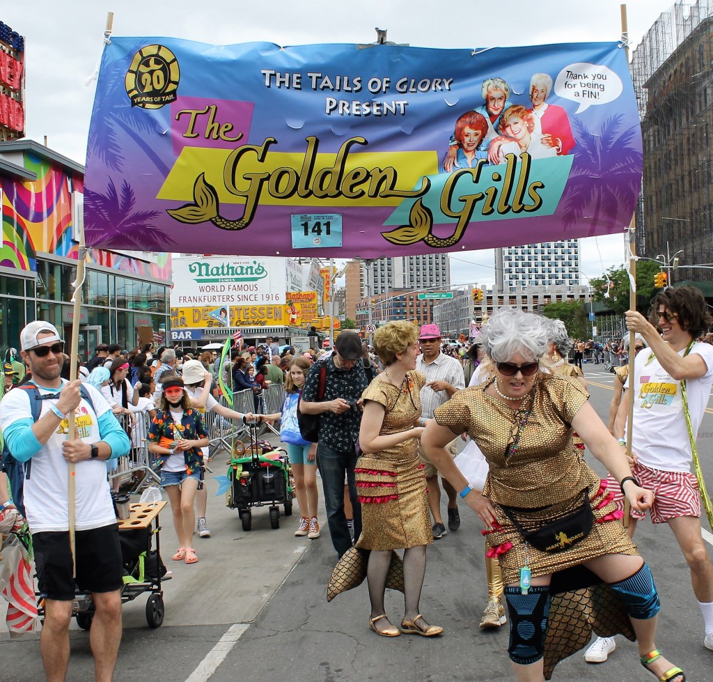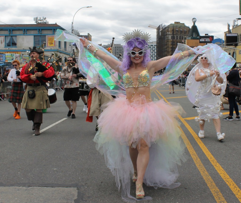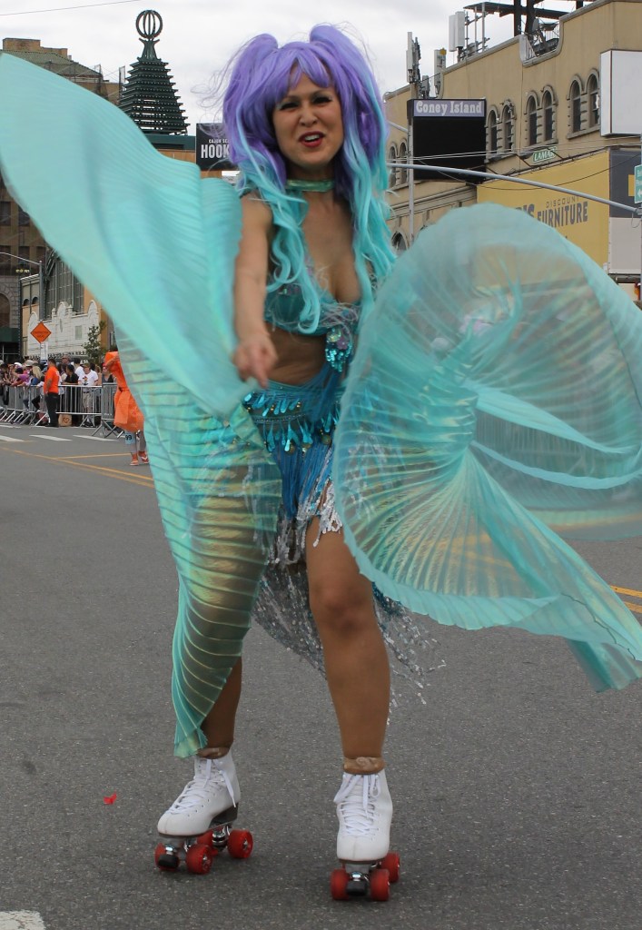 Local talent get to showcase their style and one outstanding group were the School of Fashion Industries making their way down the parade route on Surf Avenue. Just behind them you could hear the thunderous drum beat of the all female drum band Fogo Azul. They were amazing and truly having a great time at the parade. A really creative group were The Golden Gills group taking a slice from the iconic TV show The Golden Girls. Some dancers almost pulled a hammy while busting out some moves. A perennial favorite that keeps getting better every year are the Tailshakers. This dance group really sets the bar high when it comes to showing off their best moves and choreography. The Tailshakers are always on top of their game. A returning group from Baltimore were the Charm City Tails. They were amazing as always. The Mermaid Parade is a NY must see event as it showcases NYs creativity like no other place, except for the Village Halloween parade. It kicks off a summer of hot fun.
