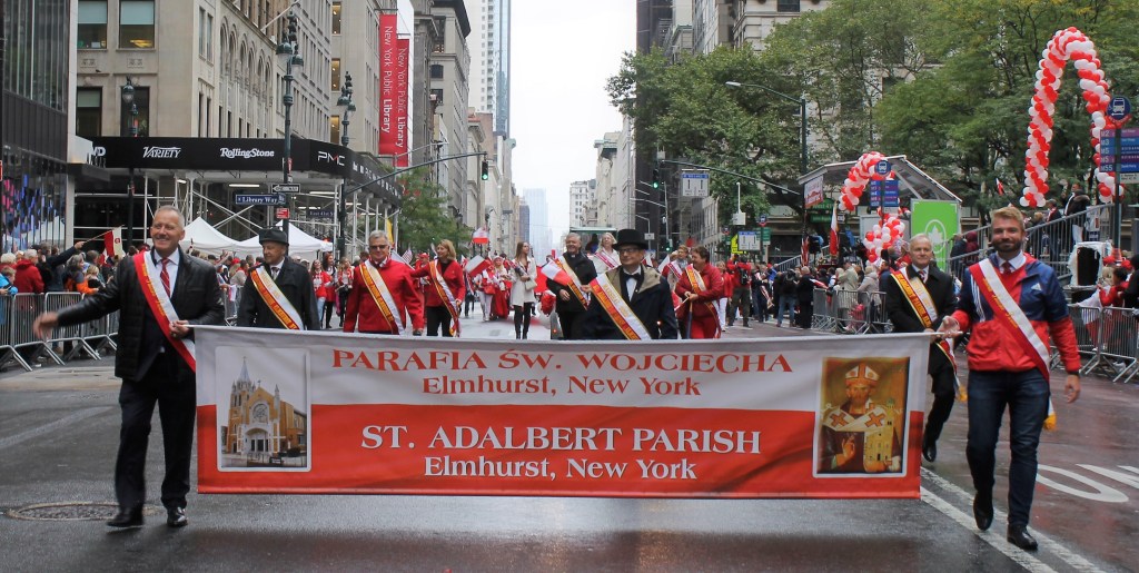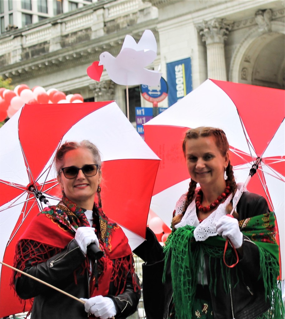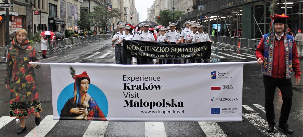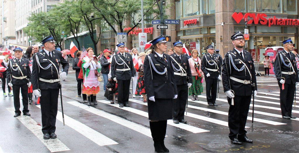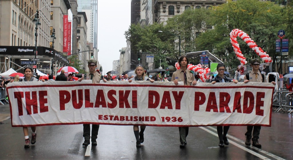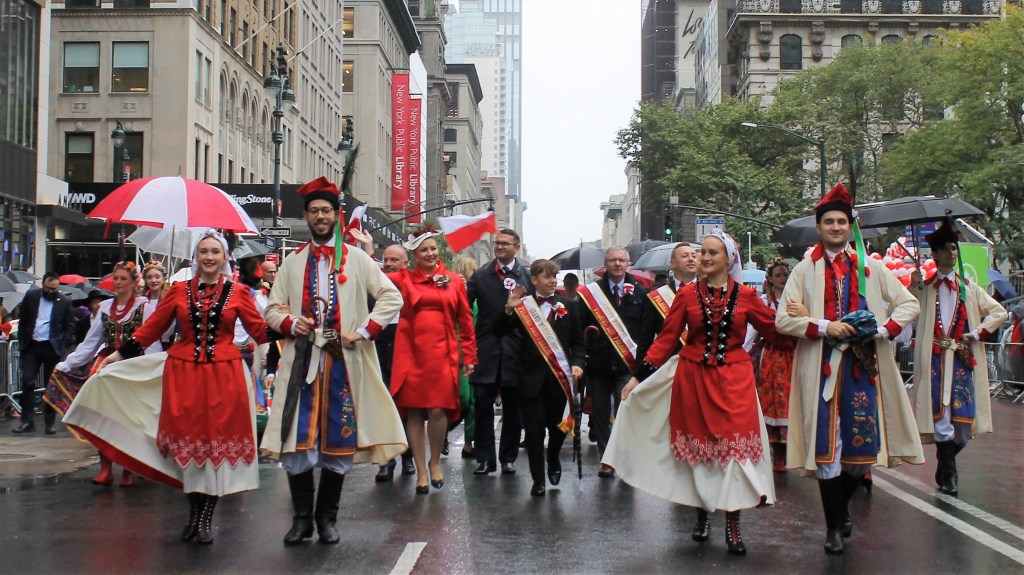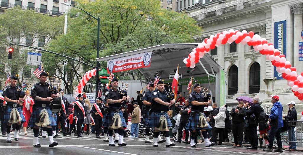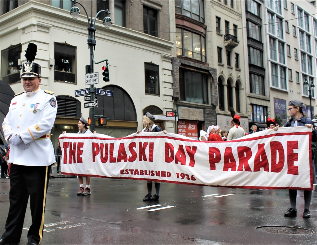 Remnants of tropical storm Ian made its way through NYC but held off enough to allow for the 85th annual Pulaski Day Parade on 5th Avenue to proceed in grand style. It’s truly the biggest celebration of Polonia (people of Polish decent) outside of Poland. The parade celebrates the heroics of Brigadier General Casimir Pulaski who served as a leader in the Continental Army during the Revolutionary War. It also unites all the Polish people from New York, New Jersey and Connecticut in a great display of class and distinction. This is really one of the NYC parades with the best dressed marchers I have seen. Dancers in traditional Polish attire make their way to the reviewing stand set up on 41st street right in front of the entrance to the famous NY Public Library where Patience and Fortitude watched with glee.